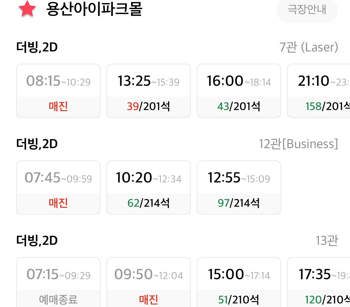 인기 많은 용아맥, 용포디, 투디 영화 다 똑같다. 절대 취소표 나오지 않을 것 같은 회차도 해당 영화 상영 시작 1시간 전부터 취소표 집중적으로 나온다. 특히 아무리 전석 매진된 인기 영화일지라도 7시, 8시, 9시 같이 이른 시간 조조라면 취소표 꼭 나온다. 그래서 취소표가 집중적으로 나오는 1시간 전부터 대기타며 무한 새로고침하면 최소 4개는 잡을 수 있다. 만약 영혼 보내기만 하지 않고 실관람까지 하고 싶다면 그냥 무작정 출발하고 영화관으로 가는 길에 취소표 잡아도 된다고 생각한다.