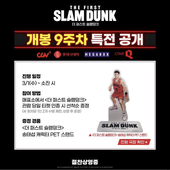 그리고 포토카드 세트 특전 때 난리였던 걸 smg에서도 인지했는지, 슬램덩크 9주차 특전은 메가박스도 영화 상영 후 지급으로 바뀌었다. 거기에 1인 회차당 최대 2개 제한까지.