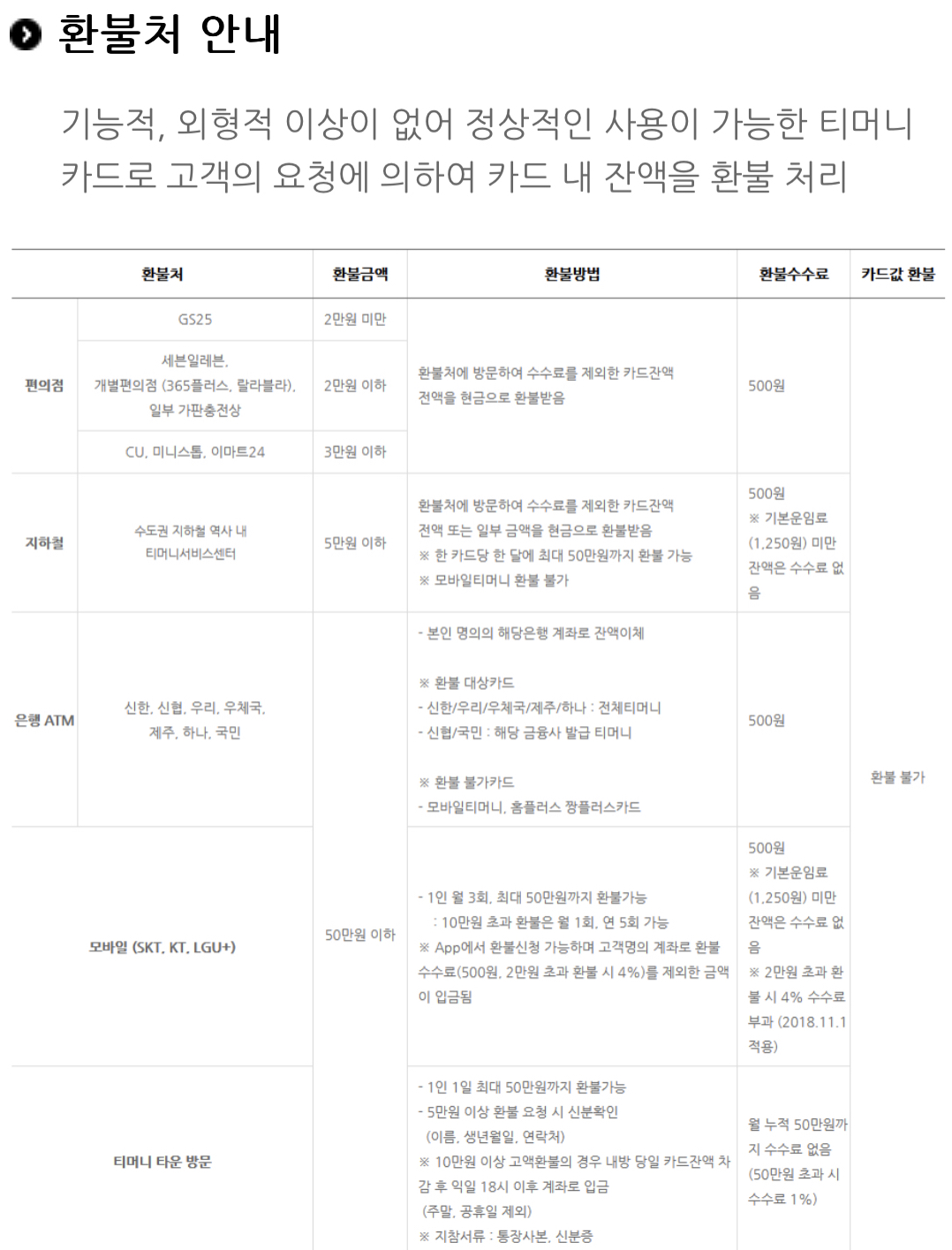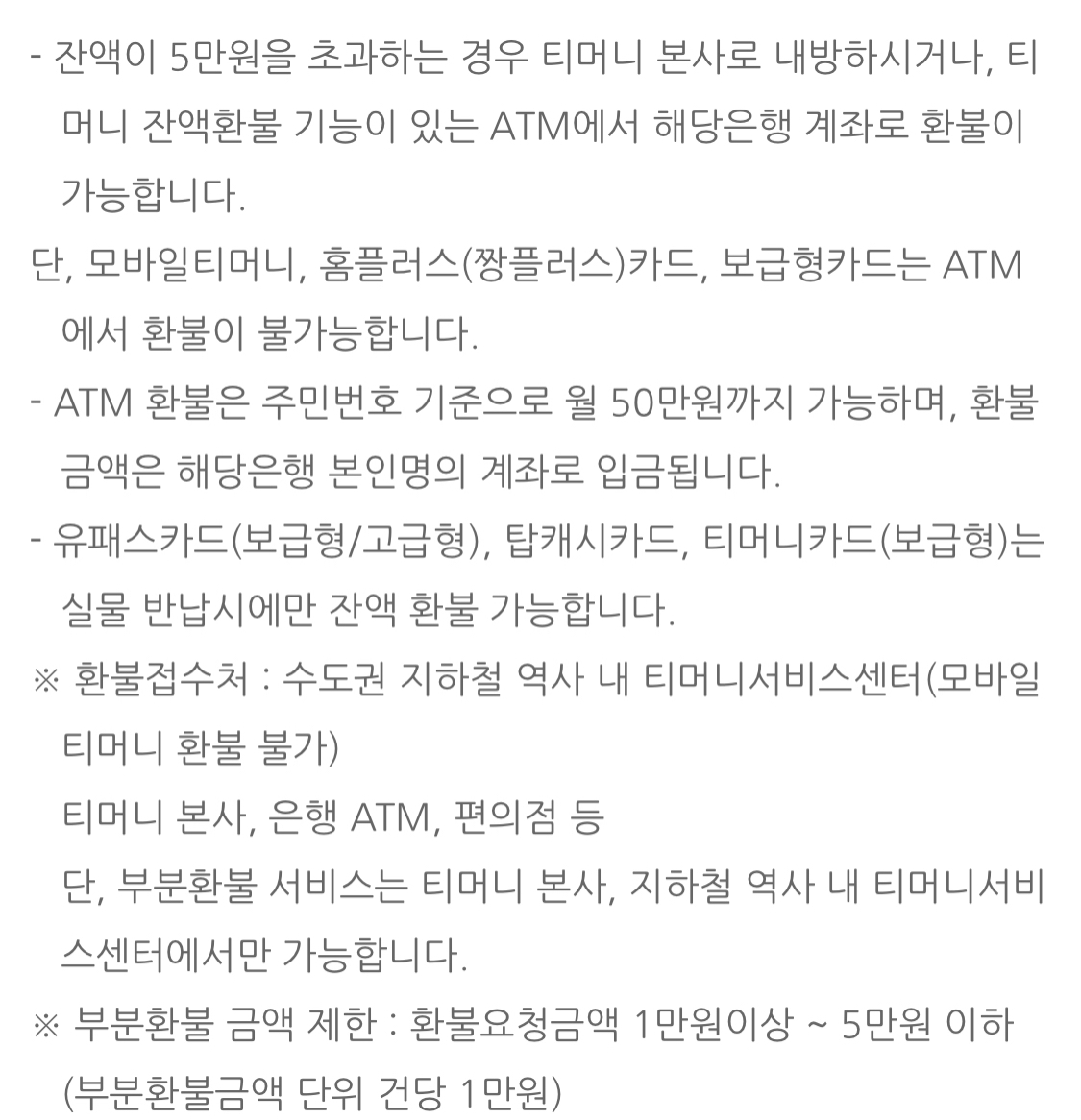 *잔액이 5만원을 초과할 경우 티머니 본사 내방 또는 티머니 잔액 환불 기능이 있는 ATM에서 해당 은행 본인 계좌로 환불 가능.