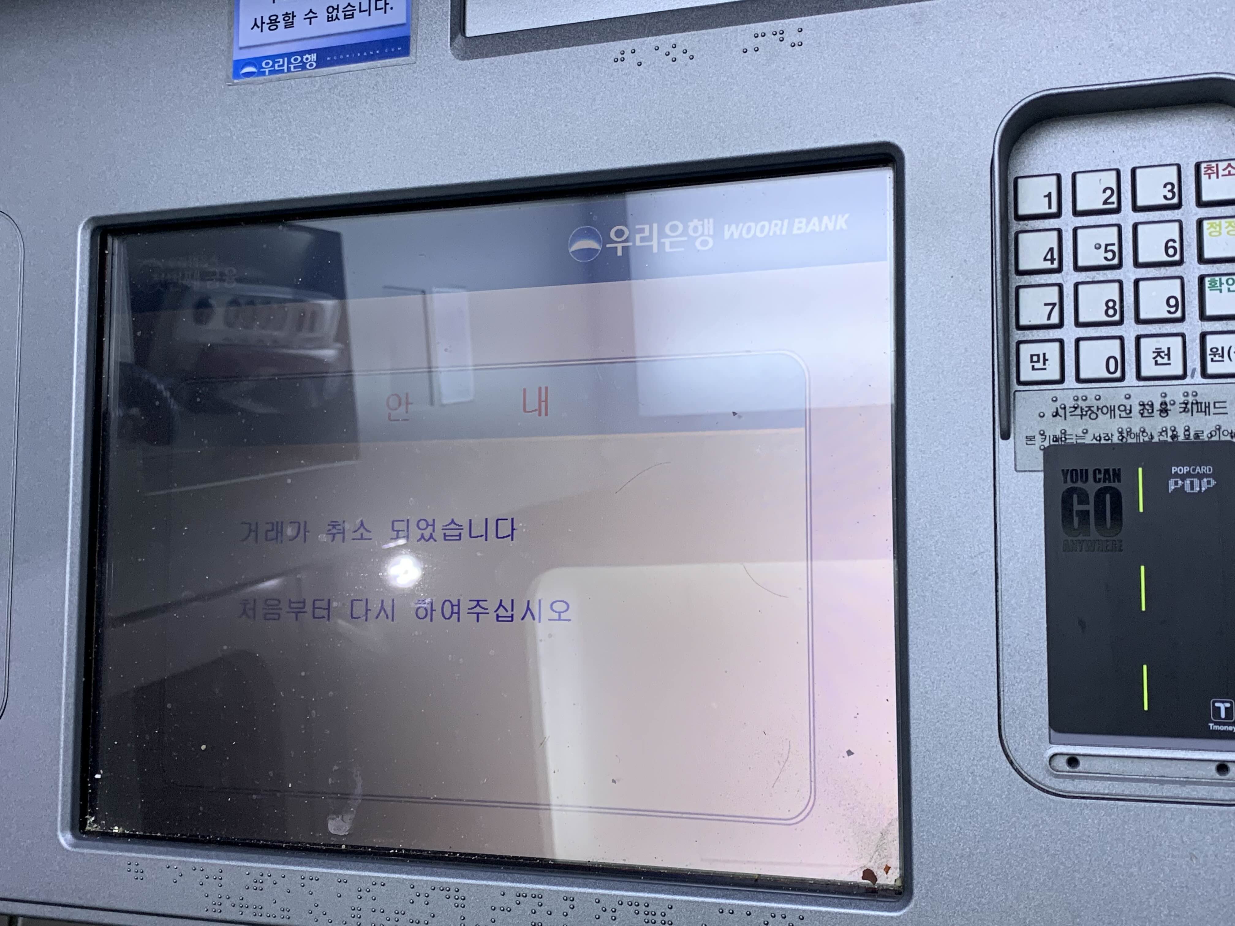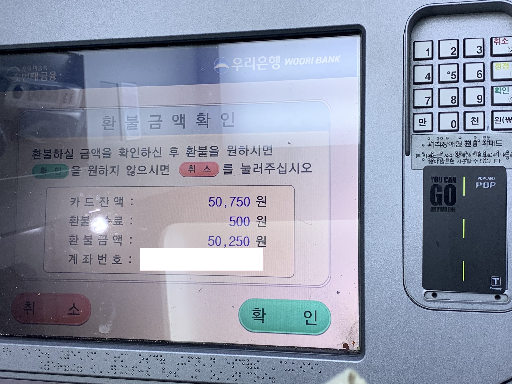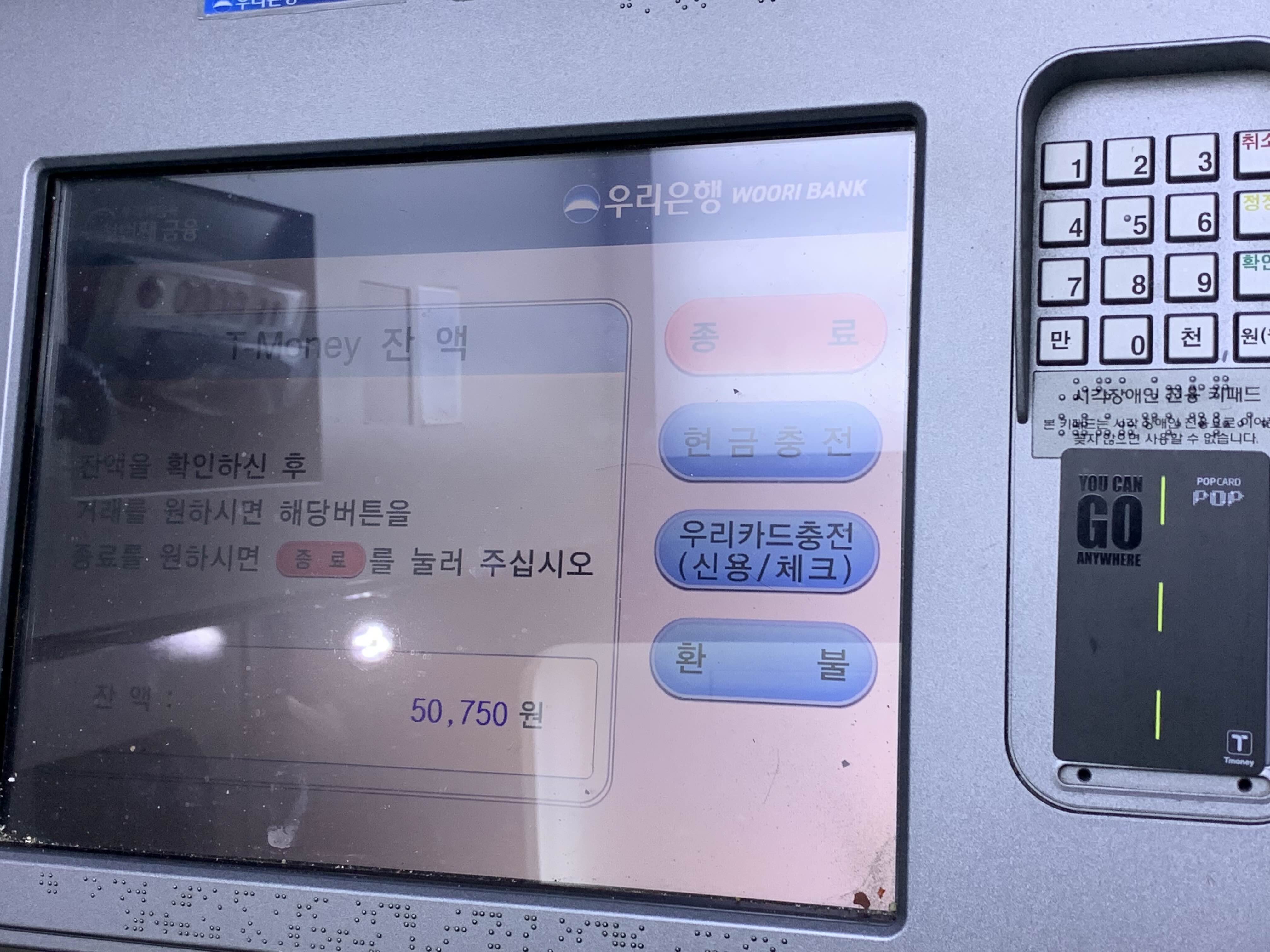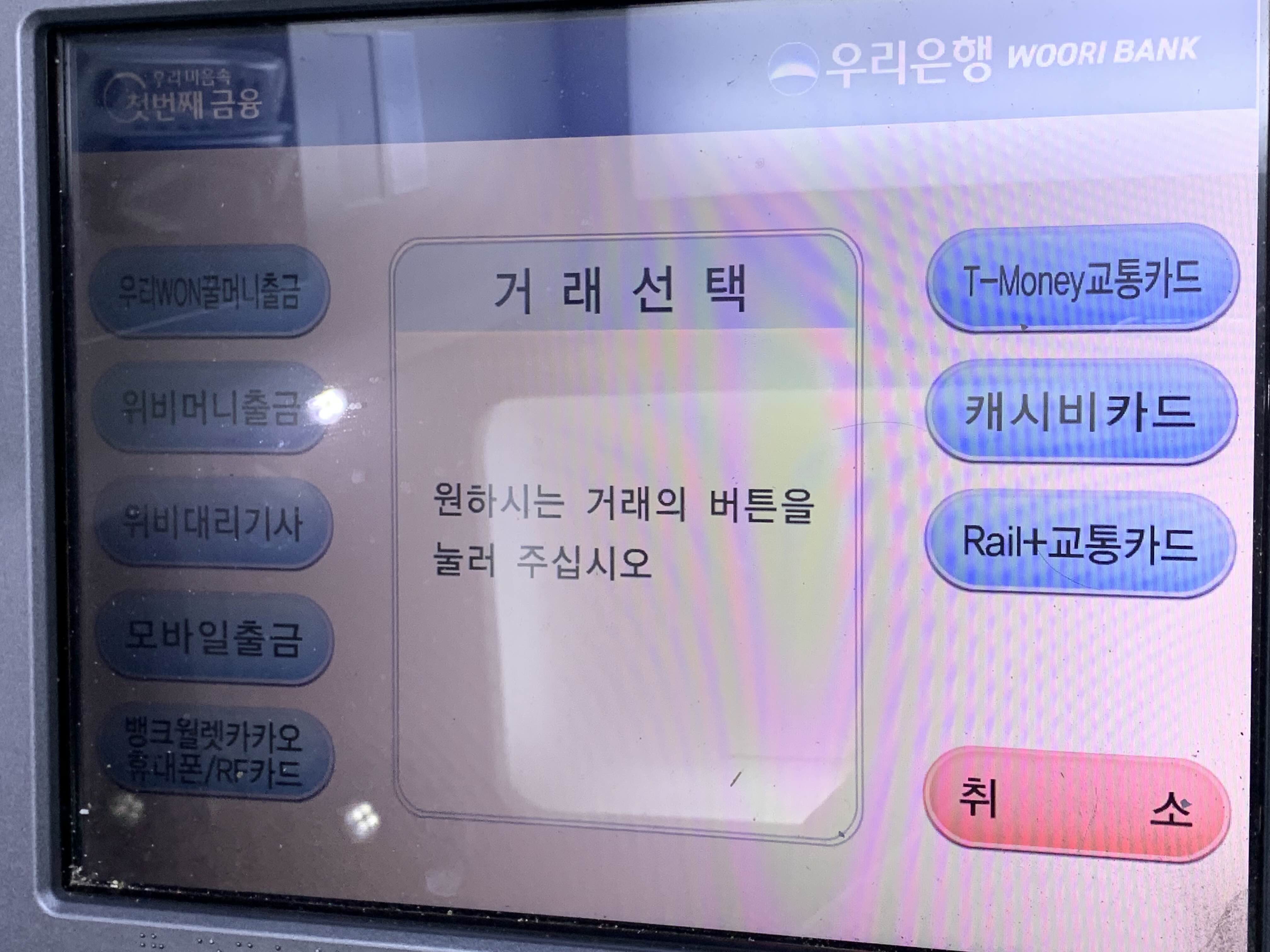 저는 5만원 이상인 티머니 잔액 50,750원을 환불하기 위해 은행 ATM으로 향했습니다. 인근에 우리은행 ATM이 있기에 그곳으로 갔습니다.