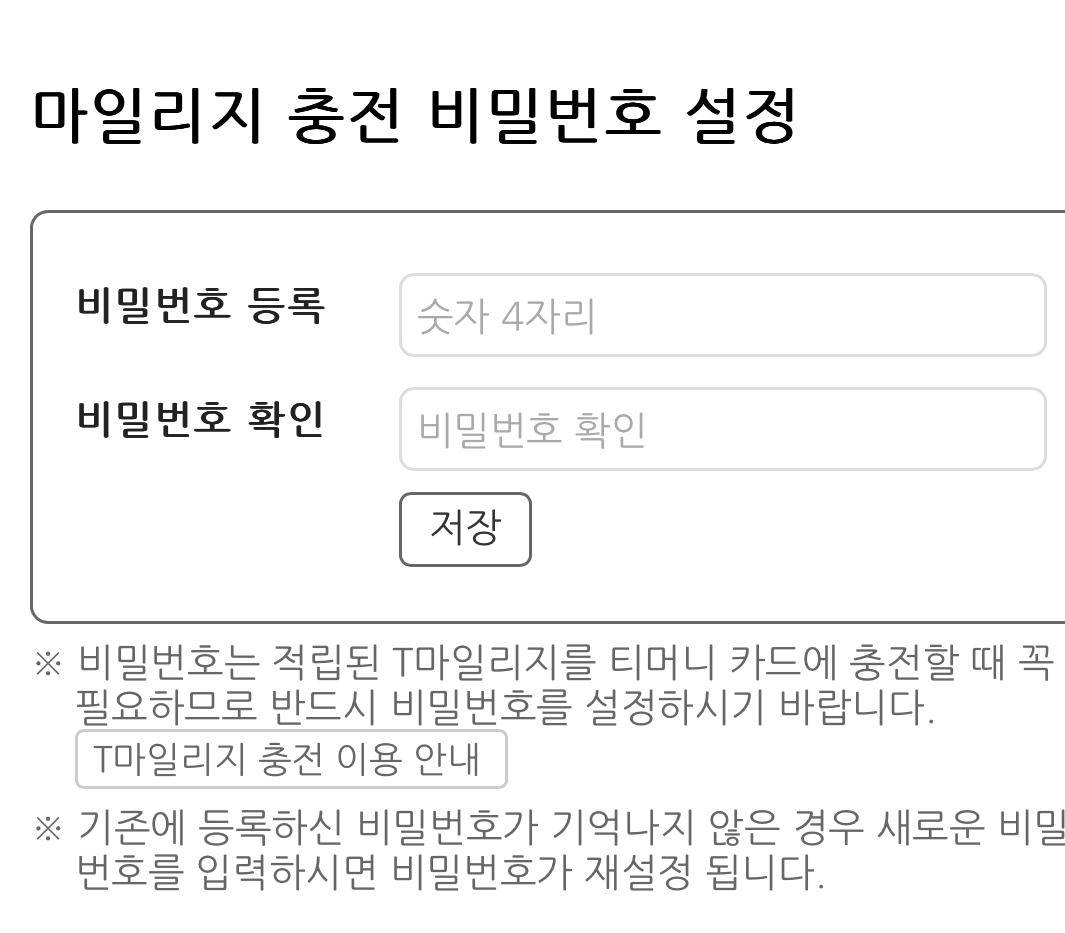 그리고 밑에 보이는 마일리지 충전 비밀번호 설정. 여기에 비밀번호를 등록해줍다.