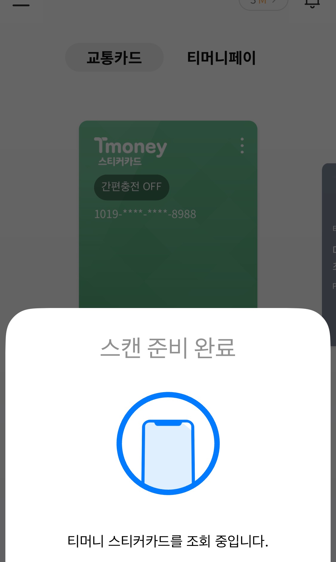 실물 티머니카드를 핸드폰 후면 카메라에 가져다댑니다. (후면 카메라 근처에 NFC가 있기에 여기에 가져다대면 티머니 교통카드가 인식됨)