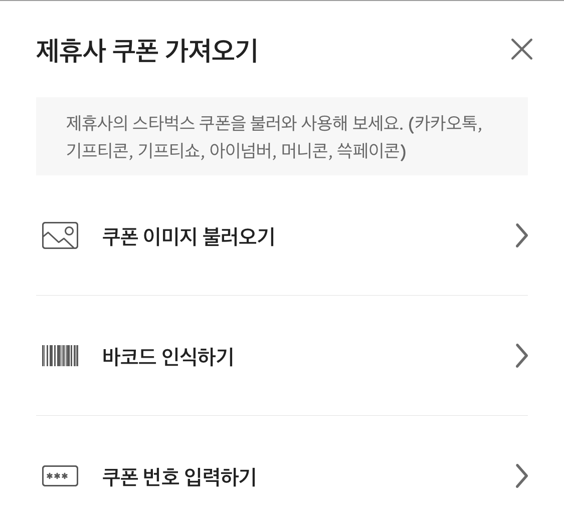 5. 쿠폰 이미지 불러오기, 바코드 인식하기, 쿠폰 번호 입력하기 중 택 1.