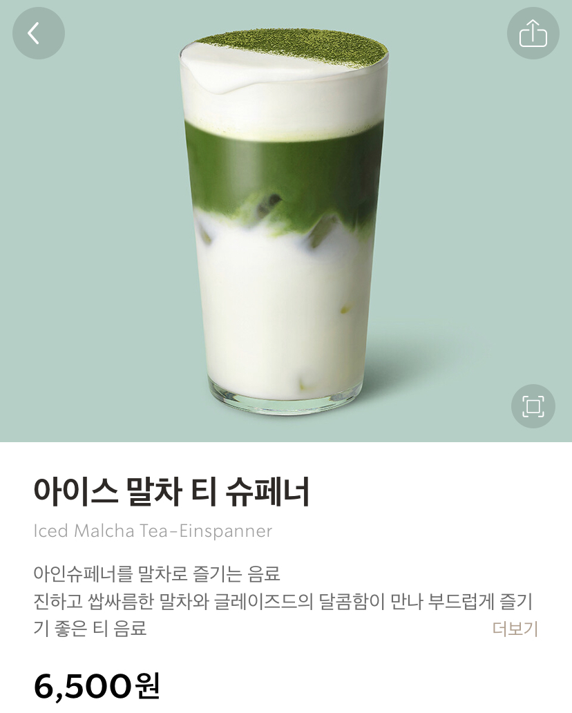 최근에 먹고 맛있어서 여러번 더 시켜먹은 아이스 말차 티 슈페너. 위에 적은 추천 메뉴들 다 제치고 이게 스타벅스 맛있는 음료 1등. 티바나 바, 리저브R매장에서만 먹을 수 있는 게 아쉬운 부분.