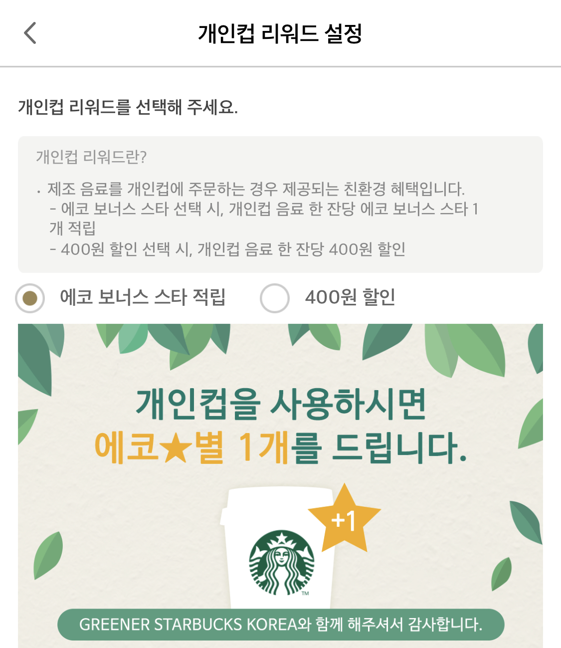 개인컵 리워드 설정 클릭 후, 400원 할인 대신 <에코 보너스 스타 적립>을 클릭해줍니다.