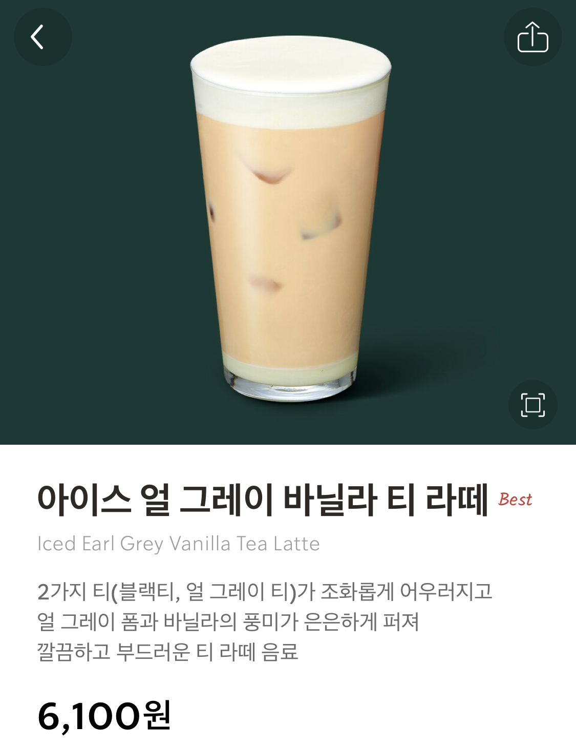 아이스 얼그레이 바닐라 티 라떼 (tall 사이즈 가격 6,100원)
