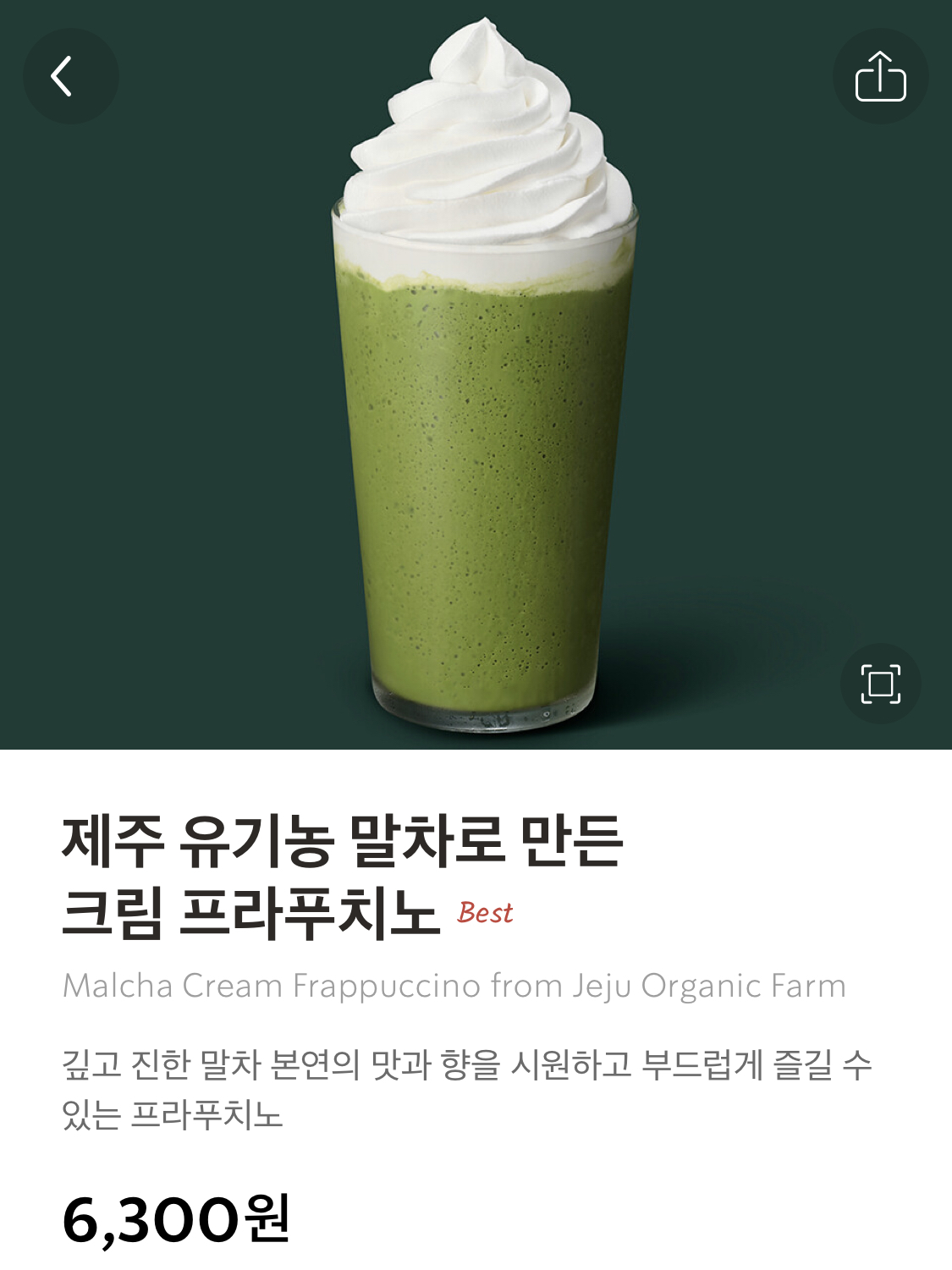 제주 유기농 말차로 만든 크림 프라푸치노 (가격 6,300원)