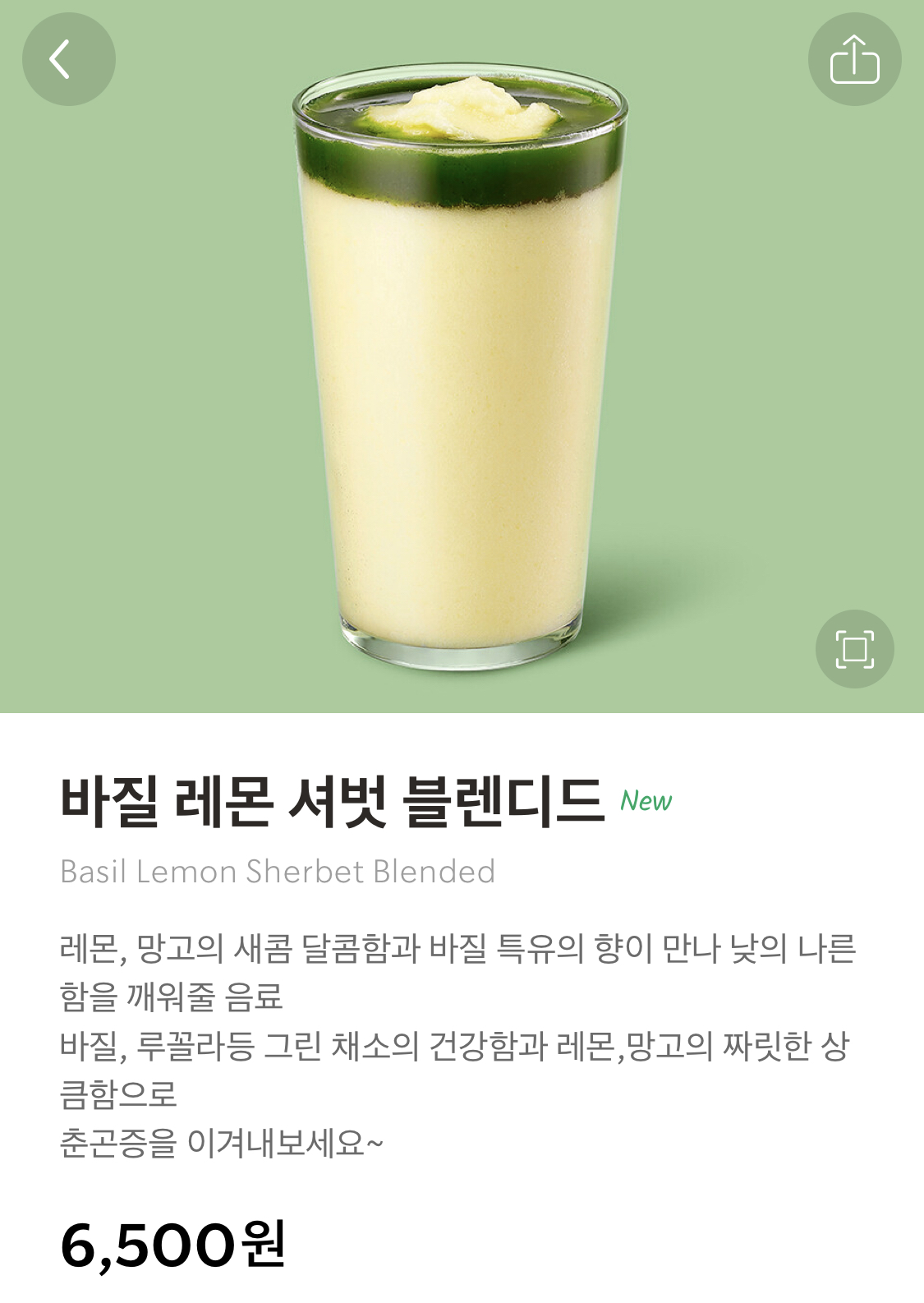 바질 레몬 셔벗 블렌디드 (가격 6,500원)