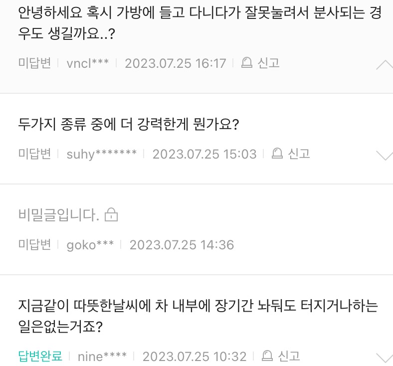 신림역 칼부림 살인사건 때문에 스프레이 구매가 급증했더라고요. 질문함도 폭발했길래 일부 캡쳐해봤습니다.