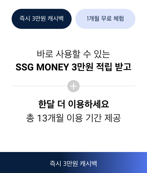 즉시 3만원 캐시백 받기 또는 한달 무료체험 해보고 한달뒤 결제후 그때 3만원 받기 중 선택. 나는 전자 선택.