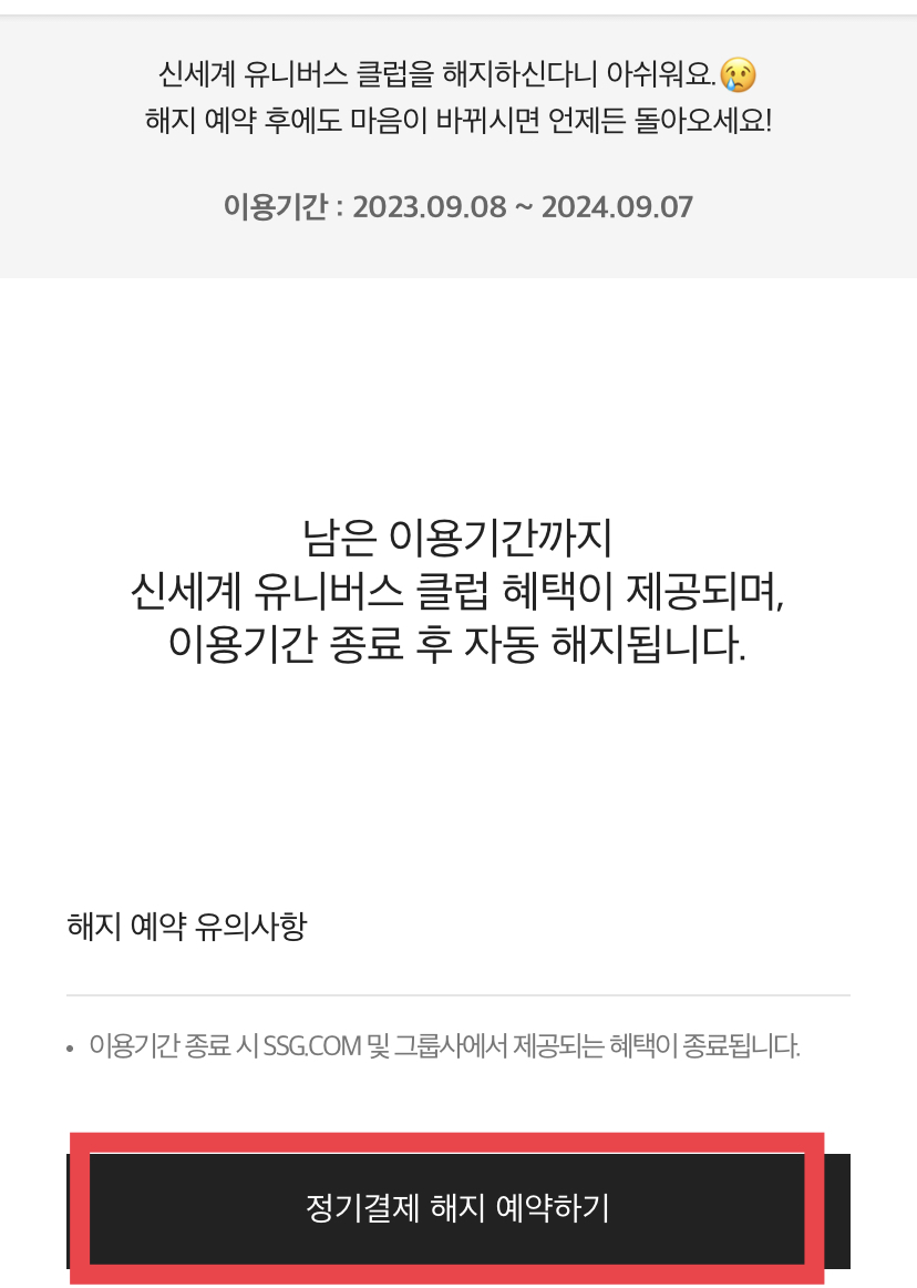 정기결제 해지 예약하기 누르면, 최종 해지 완료.