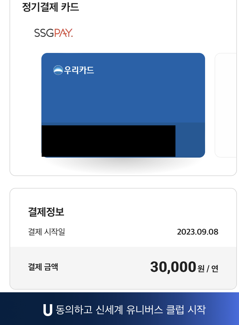 카드를 등록하고, 신세계유니버스클럽 시작 클릭.
