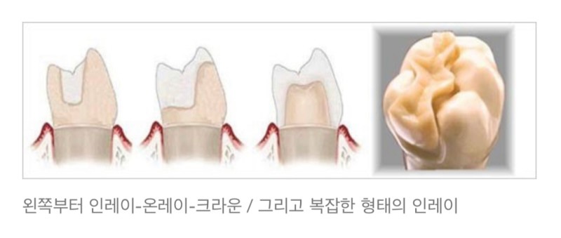 치아 손상 적은 순으로 나열. 인레이-> 온레이-> 크라운.