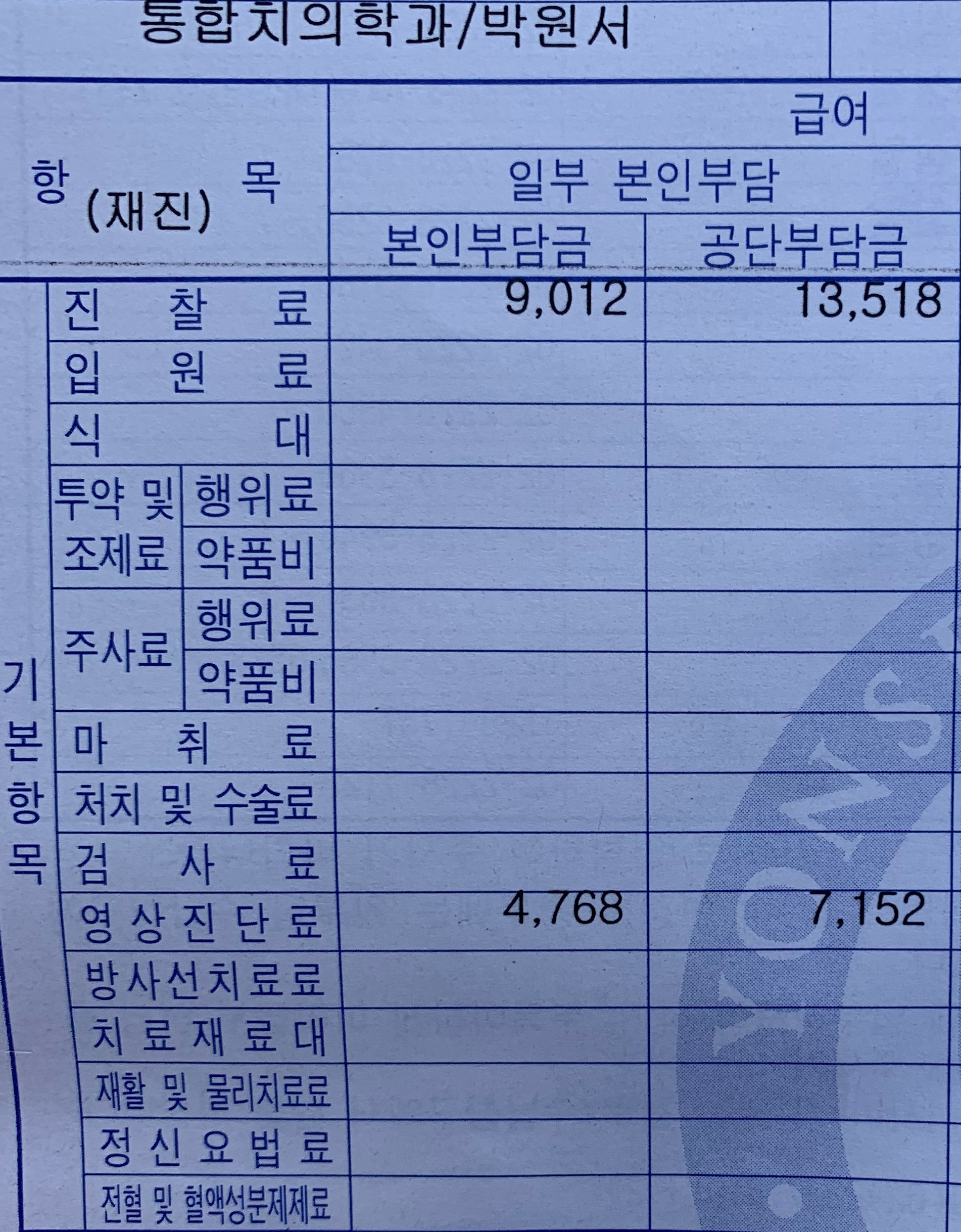 1. 통합치의학과 진찰료: 9,000원