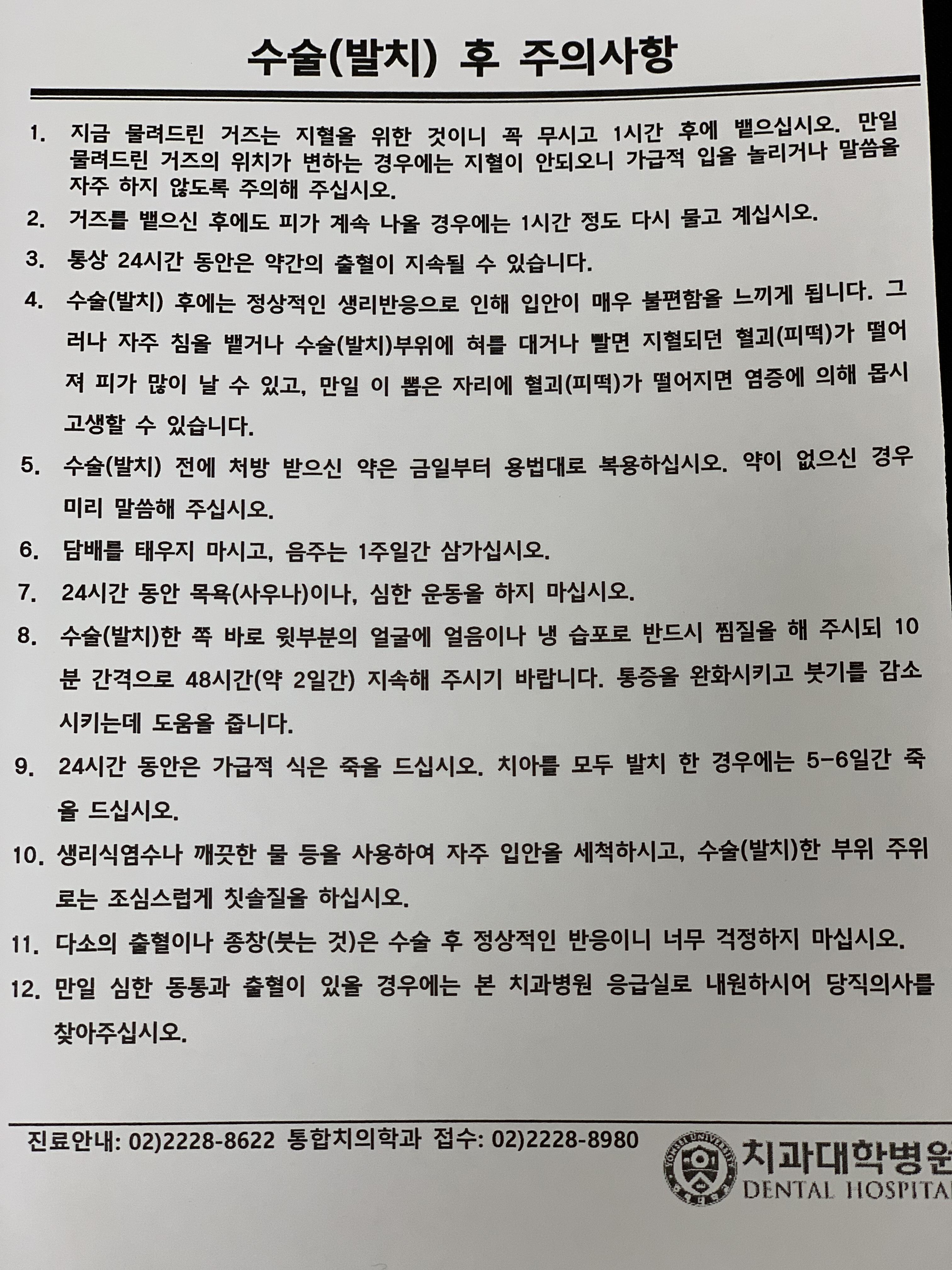 일반 치과 병원에서는 발치 한 시간 전에 약 안 먹어 된다고 했었는데, 대학병원에선 발치 한 시간 전, 처방해준 약 반드시 먹고 오라고 하더군요. 알고 보니 이 발치전 복용약이 발치 후 일어나는 통증을 상당히 감소시켜준다고 하더라고요. (그리고 일반 치과 병원에서는 윗니 사랑니 며칠 간격으로 하나씩 발치해야 한다고 했는데, 대학병원에서는 워낙 간단한 발치라 그냥 두 개 한꺼번에 뽑아도 상관 없다고 했습니다 그리고 한번에 이빨 두 개가 털려본 결과, 정말로 상관 없었습니다)