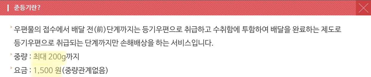 가격은 1,500원. 중량 최대 200g. 거의 익일 배송. 배송 빠른 편. 등기소포와 일반소포의 사이. 등기번호가 발급되기에 배송 추적은 가능하나, 분실시 보상은 어려운 편. 우편에 비해 비교적 분실 위험이 적긴 하나, 나의 경우 준등기 분실 경험 존재.