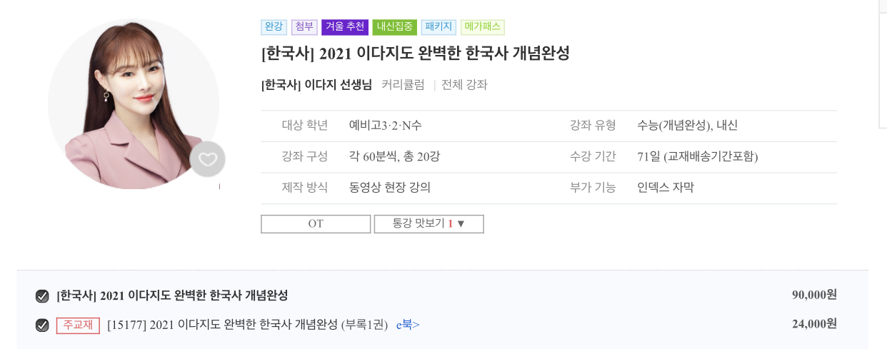 이다지 강사의 50강짜리 심화 한국사 강좌와 20강짜리 수능 강좌 중 무엇을 들을까 고민했다.