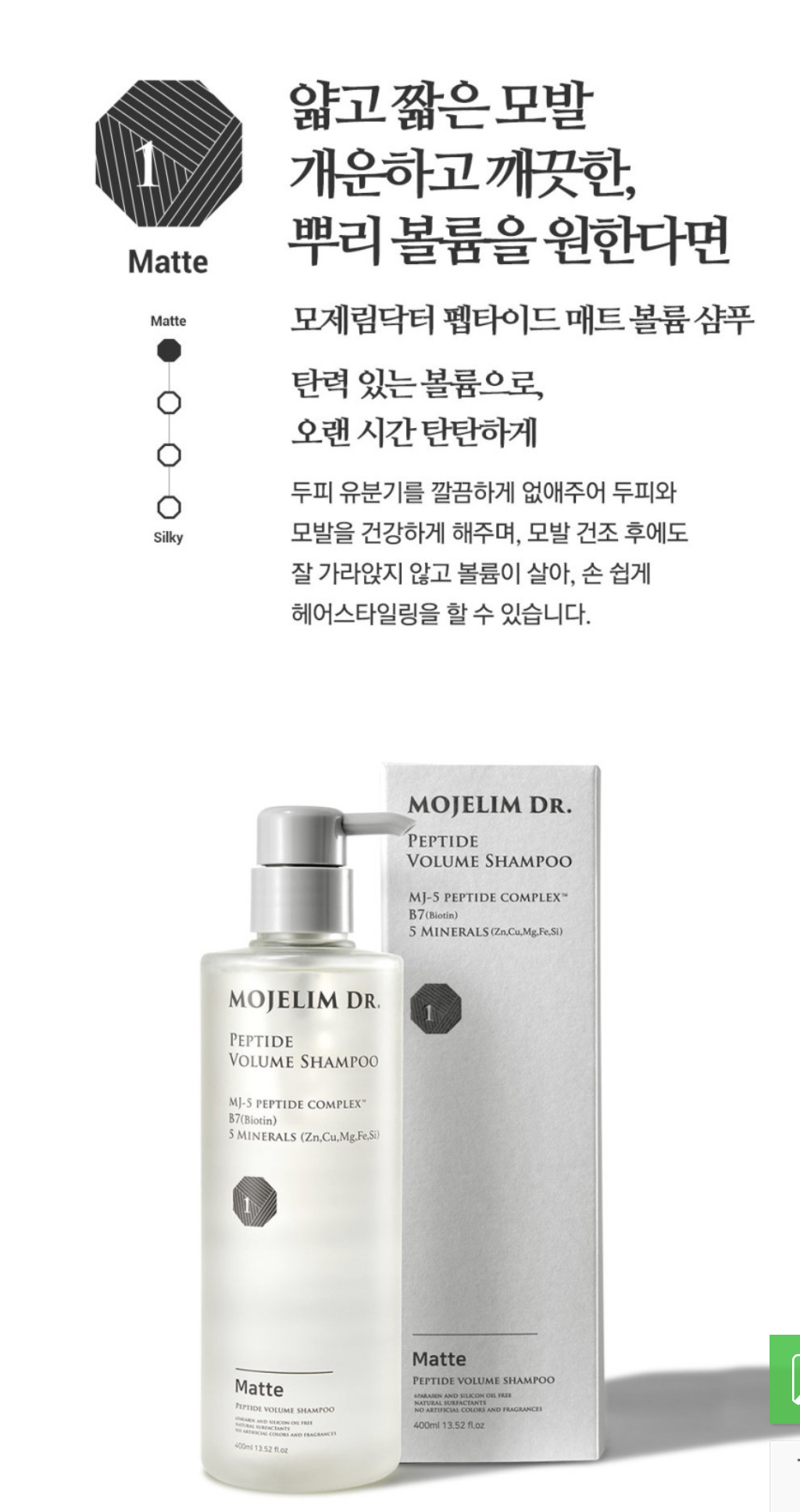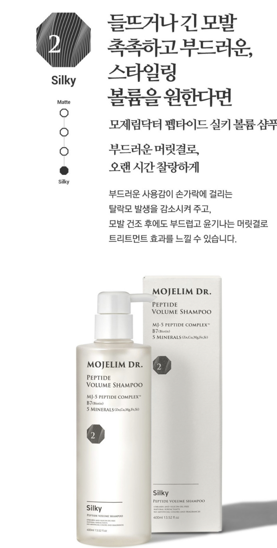 신제품 이름은 ‘모제림 펩타이드 볼륨 샴푸’. 매트와 실키 두 타입으로 나왔다.