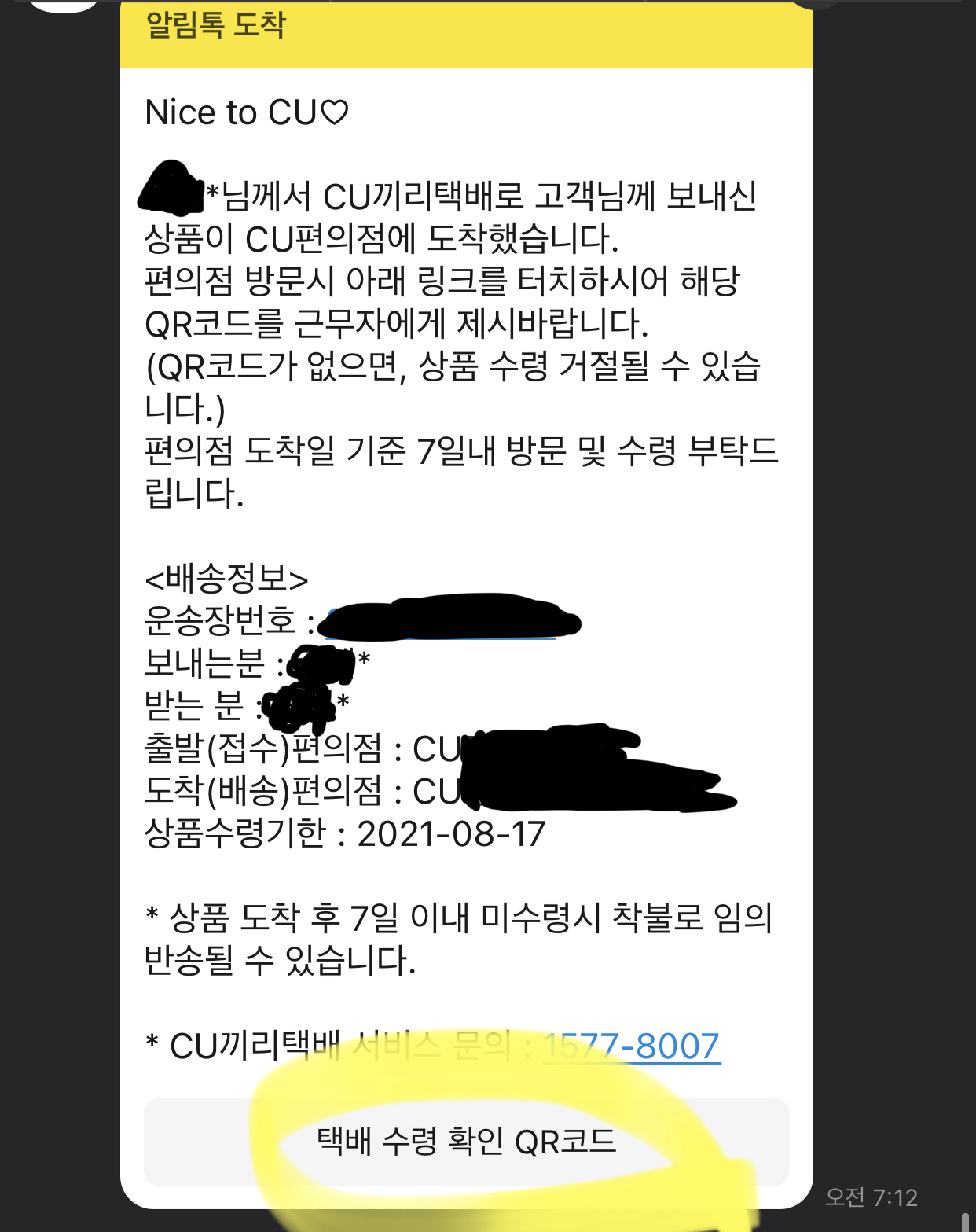 CU는 메세지 받은 후로부터 7일 이내, GS25 지에스는 3일 이내 물건 수령하러 편의점으로 가야한다.