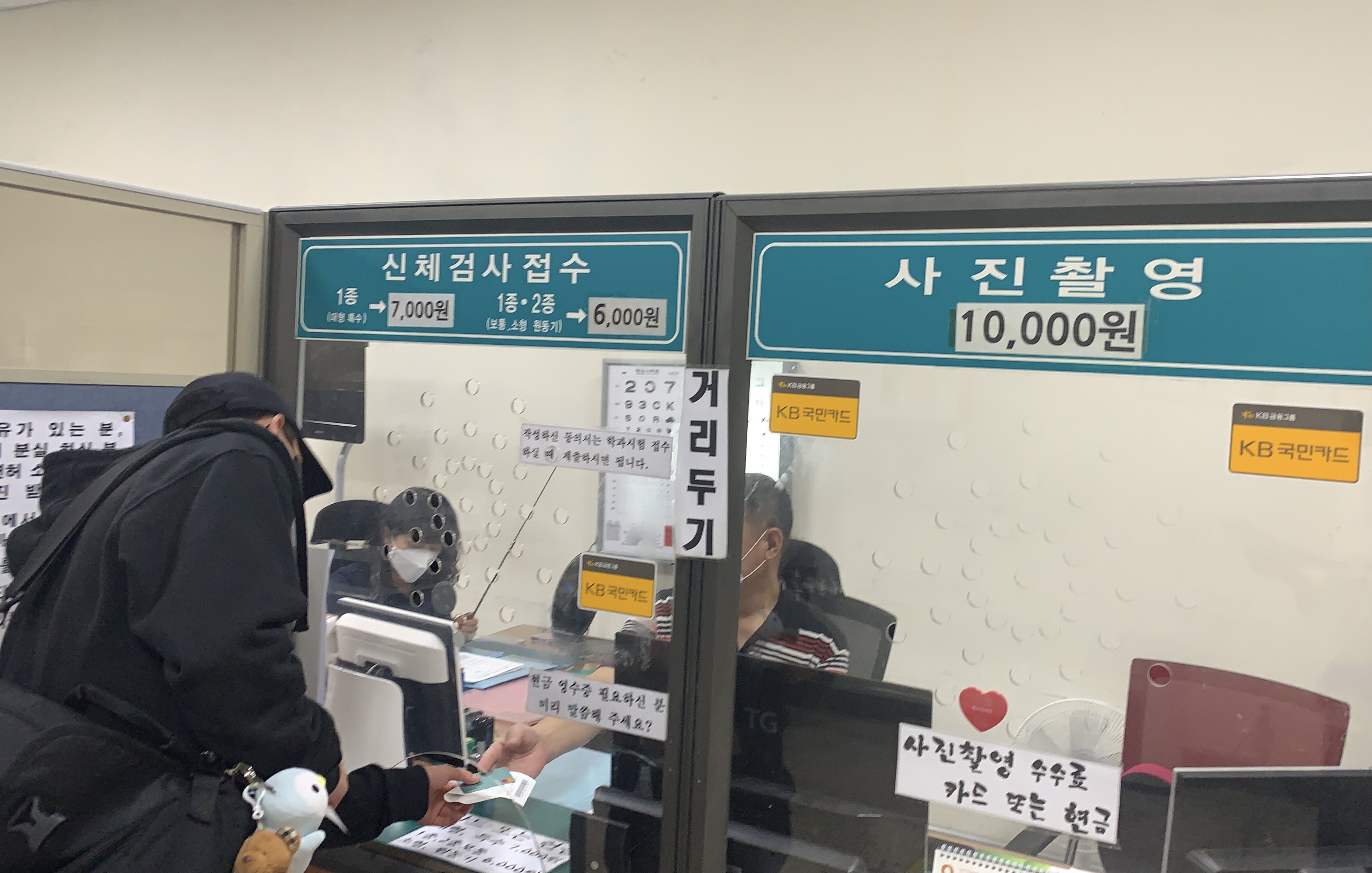 신체검사실로 이동하여 원서 제시 후 신체검사료 결제하면 됩니다. 1종•2종 보통은 6,000원 지불하면 됩니다. 현금 결제 카드 결제 둘다 가능합니다.