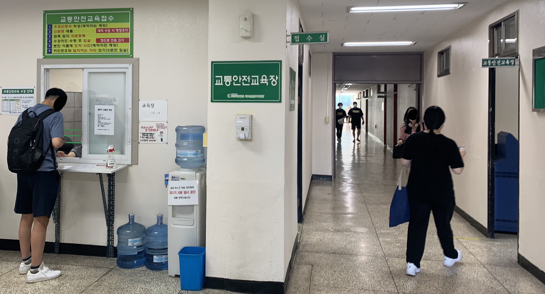 사진에 보이는 왼쪽 접수처에서 왼손 지문 검사-> 신분증 제시-> 예약자 명단에 적힌 본인 이름 옆에 서명하기-> 번호표 적힌 수강 카드 받으면 번호 일치하는 자리에 착석-> 정각 되면 영상 시청하기(1시간 소요)