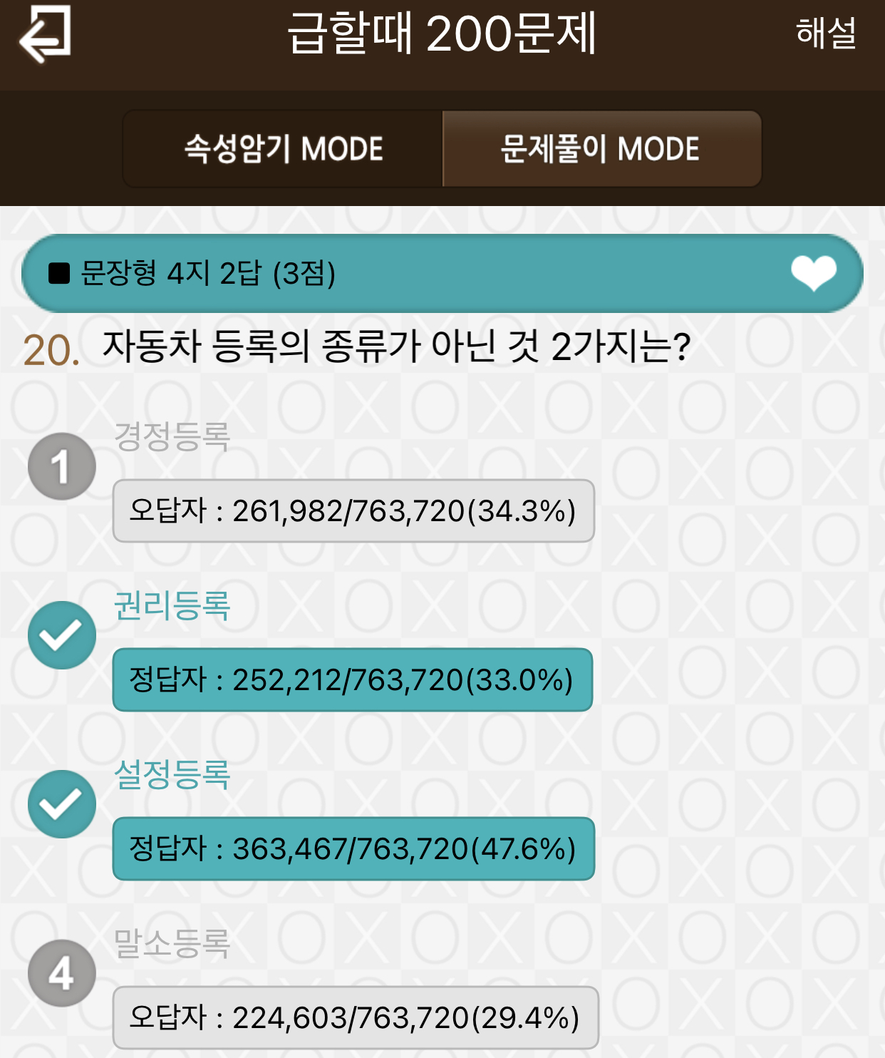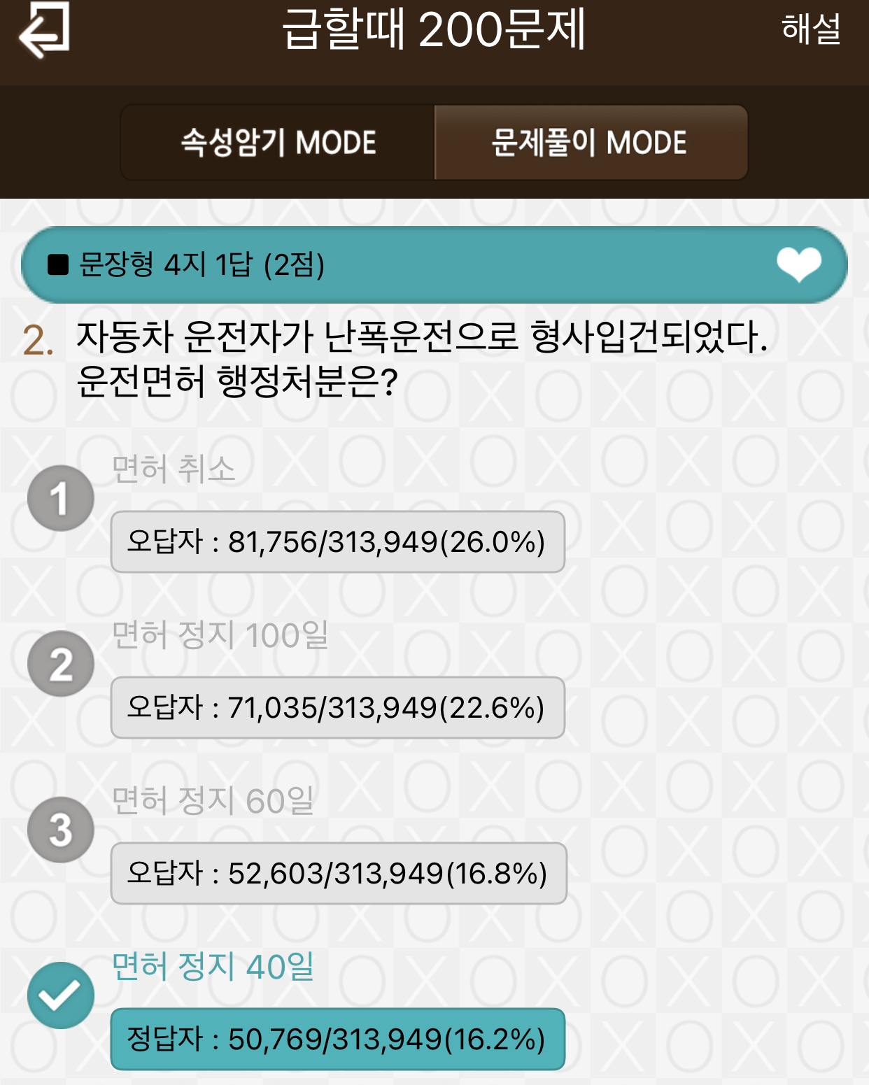 공부할 시간이 1시간밖에 없다 하시면 급할 때 200문제를 클릭해 속성암기 모드로 설정한 뒤 이것만이라도 대략 훑어보고 가는 게 좋습니다.