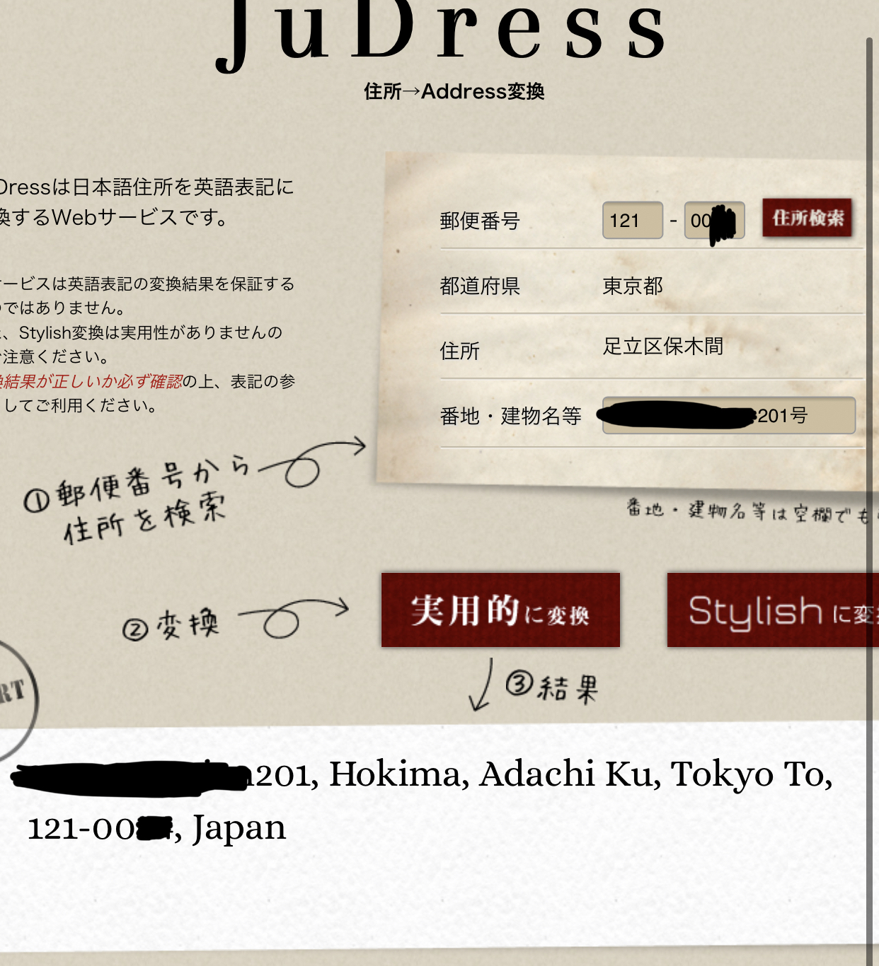 JuDressは日本語住所を英語表記に変換するWebサービスです。実用的な変換だけでなく、実用性のないStylish変換もあります。