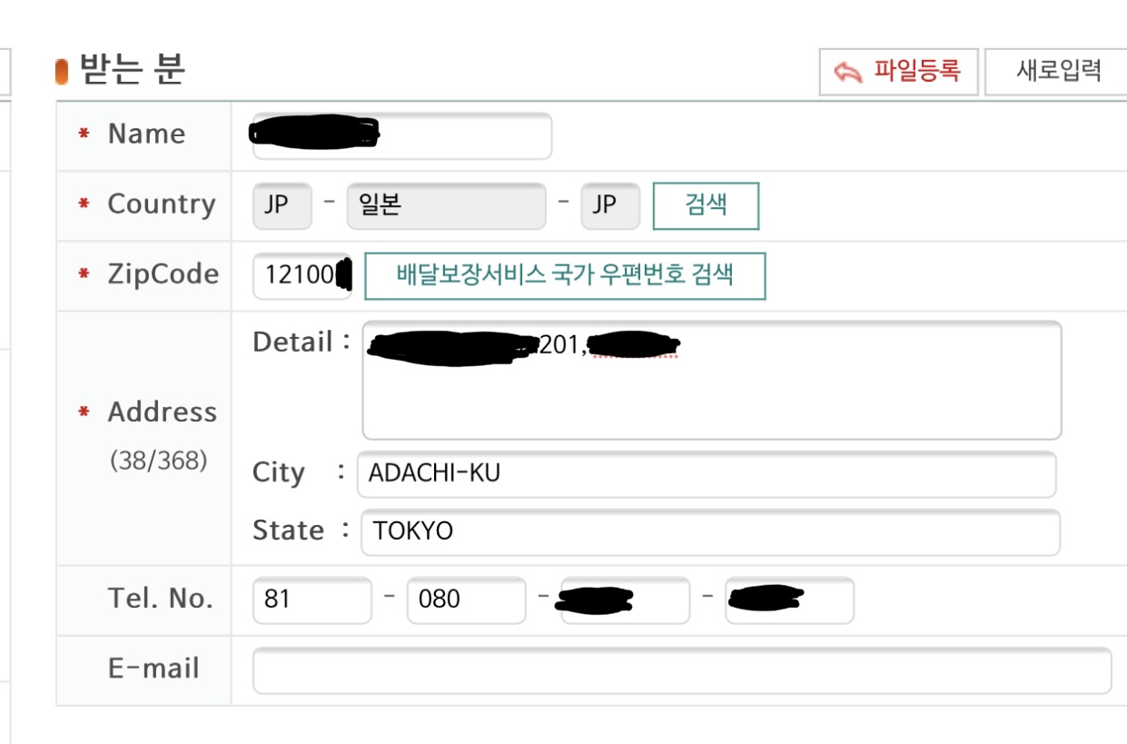 *우체국 사이트에는 일본 우편번호 다섯 자리만 입력 가능하도록 되어 있습니다. 우편번호 일곱자리 중 앞의 다섯 자리만 입력하여 검색 버튼 누른 뒤, 나머지 두 자리는 추가 작성해주면 됩니다.