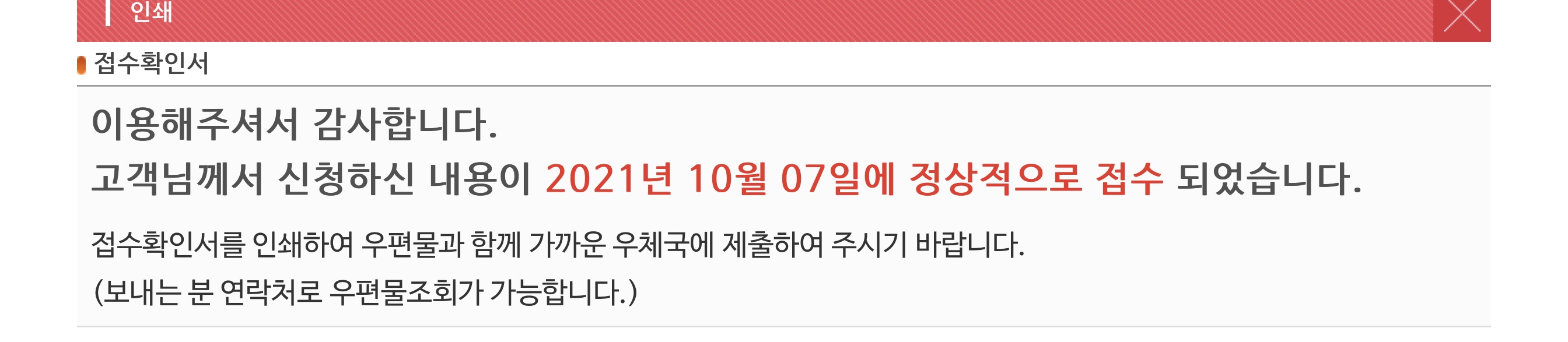 접수 확인서를 인쇄하라는데, 안해도 괜찮습니다. 우체국 방문하여 핸드폰 번호만 불러주면 직원분이 알아서 처리해주십니다.