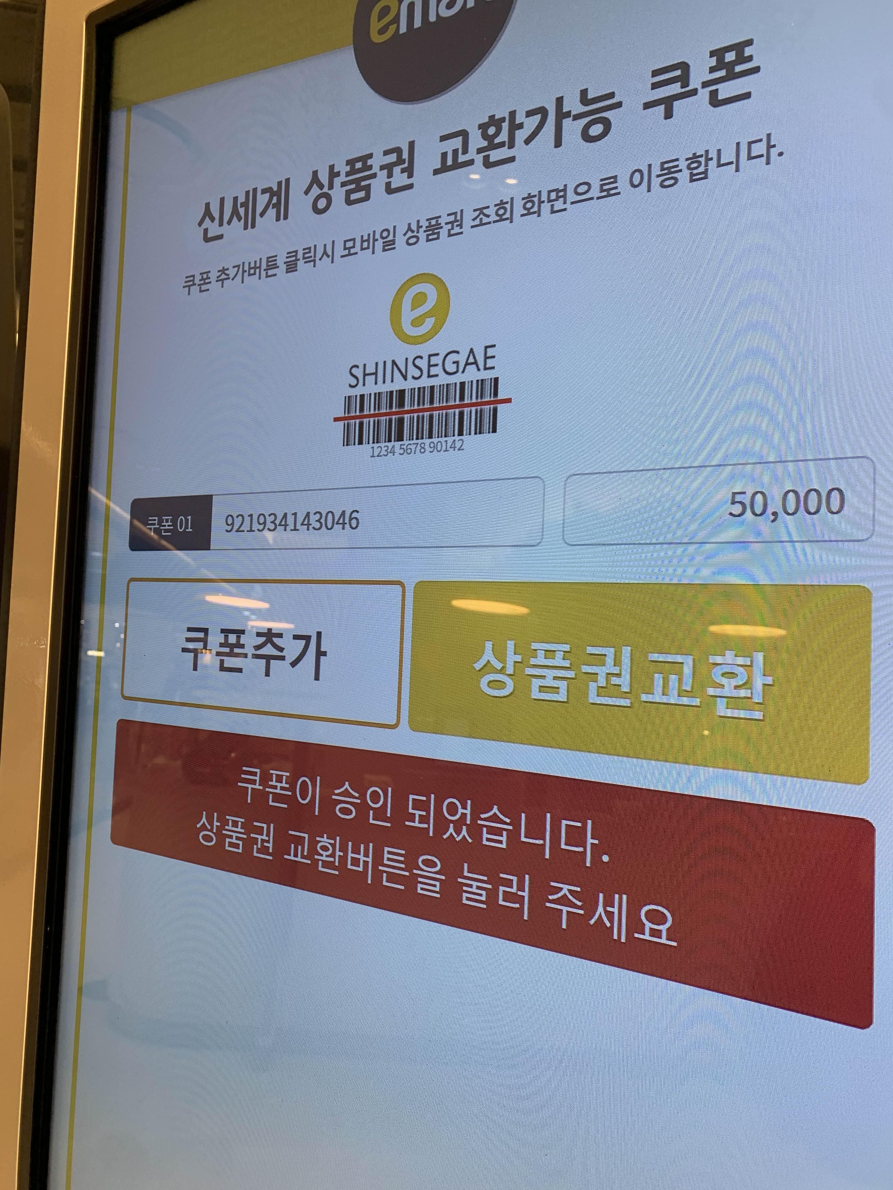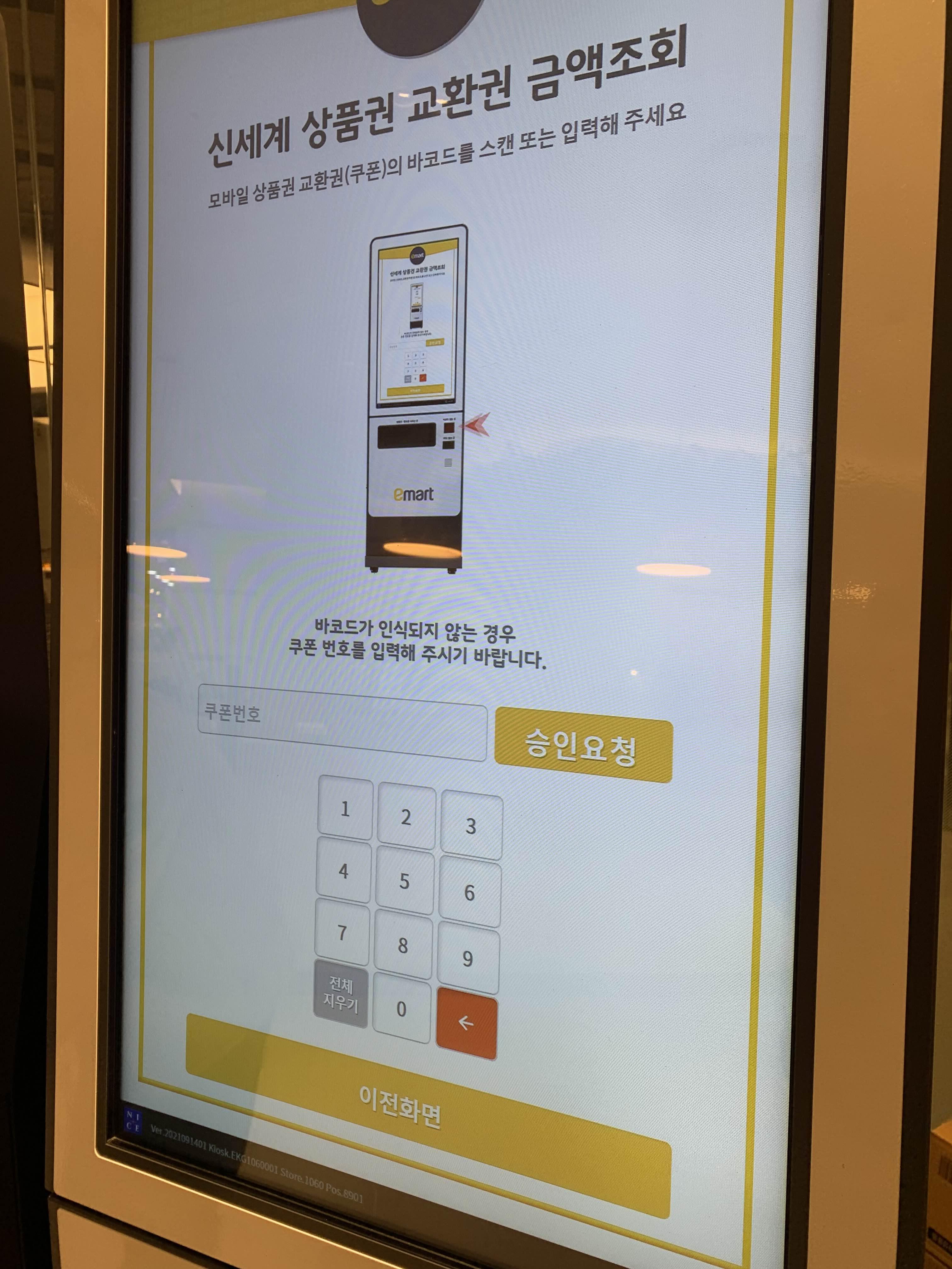 2. 키오스크 앞에 서서 신세계 상품권 교환을 클릭합니다.