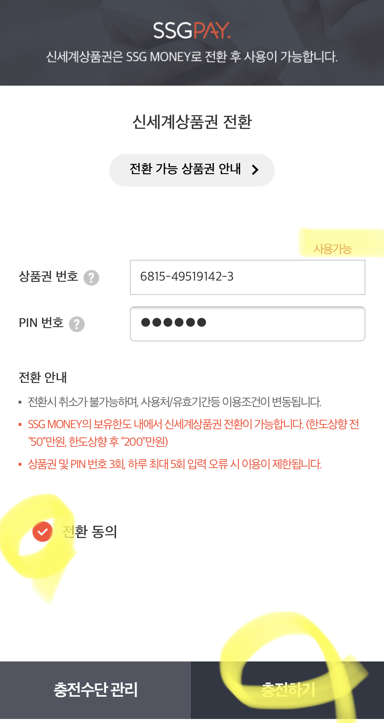 1번) 이마트 또는 신세계백화점 고객센터 방문 후, 스크래치 있는 상품권으로 교환한다. 그리고 스크래치를 긁어 핀 번호를 확인한 뒤 쓱머니 어플에서 직접 상품권 번호와 핀 번호를 입력하여