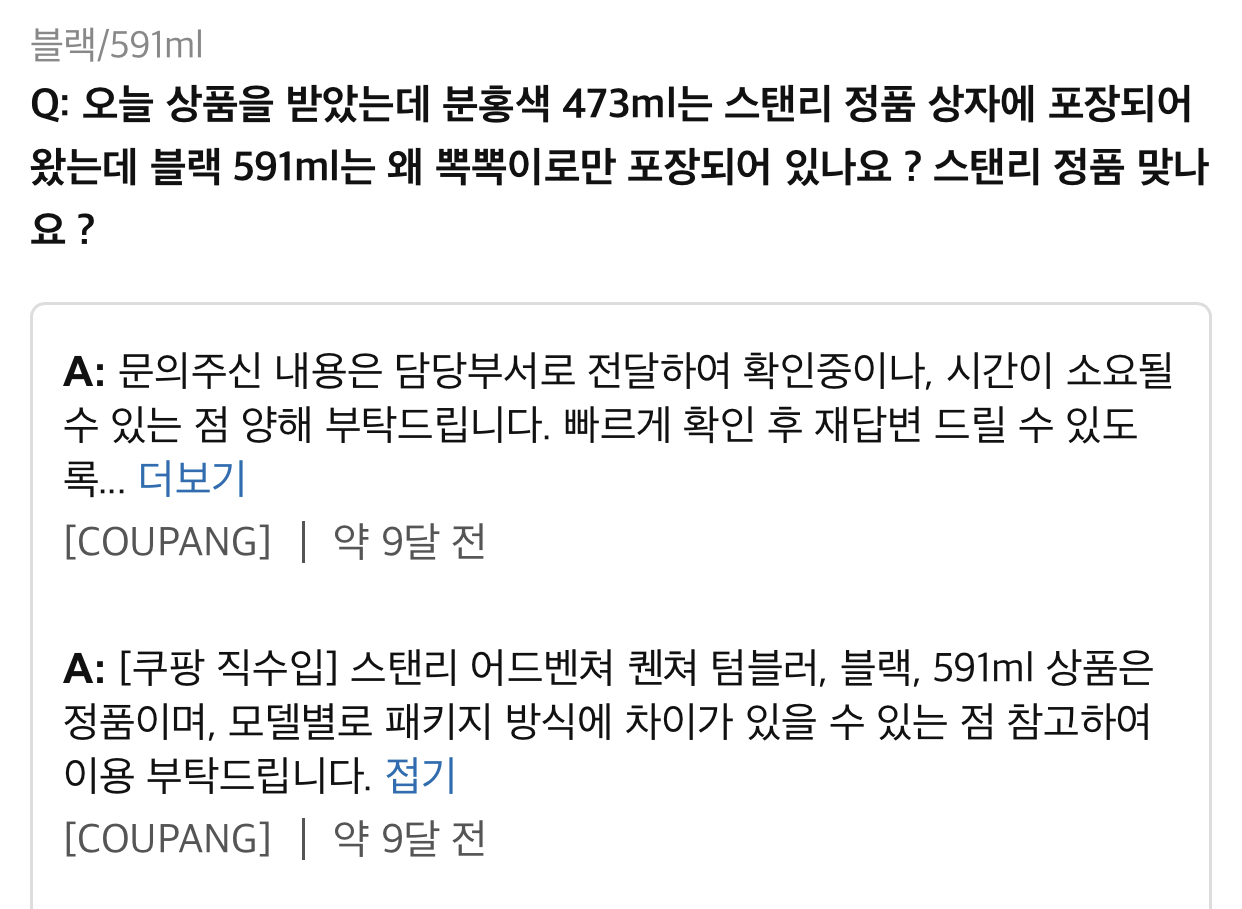 그런데 쿠팡 상품 큐앤에이 게시판을 보니 정품이 맞냐, 바닥에 거울이 없는데 왜그런 거냐, 왜 박스 포장이 아닌 비닐 포장이냐는 질문이 있었다.
