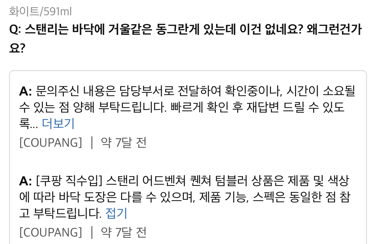 : 제조 공정이 바뀌었기 때문에 2022년에 나오는, 특히 591ml 스탠리 텀블러는 하단 부분 전체 도장처리 되어있다. 거울 없는 상품 정상 제품 맞다.