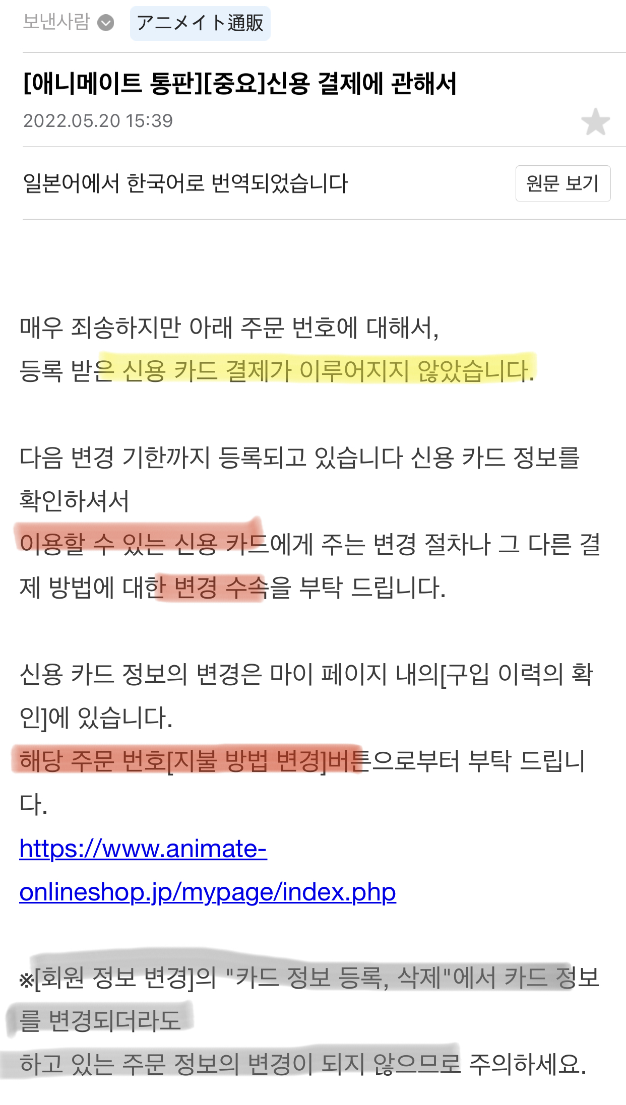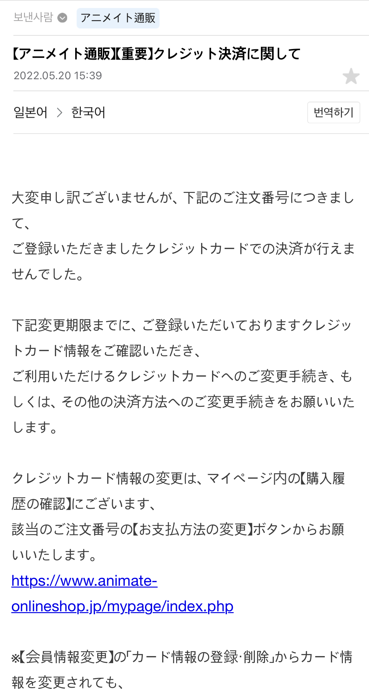 결국 애니메이트 주문시 사용했던 카드를 정지 완료, 며칠 후 새로운 카드가 도착했을 때쯤 시기적절하게 애니메이트 측에서 결제시도를 했고 승인 거절 문구와 함께 결제가 되지 않았습니다.