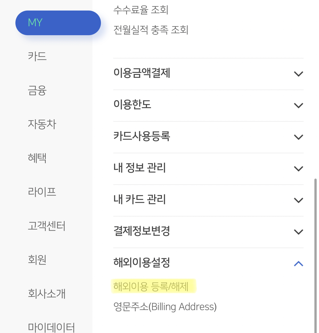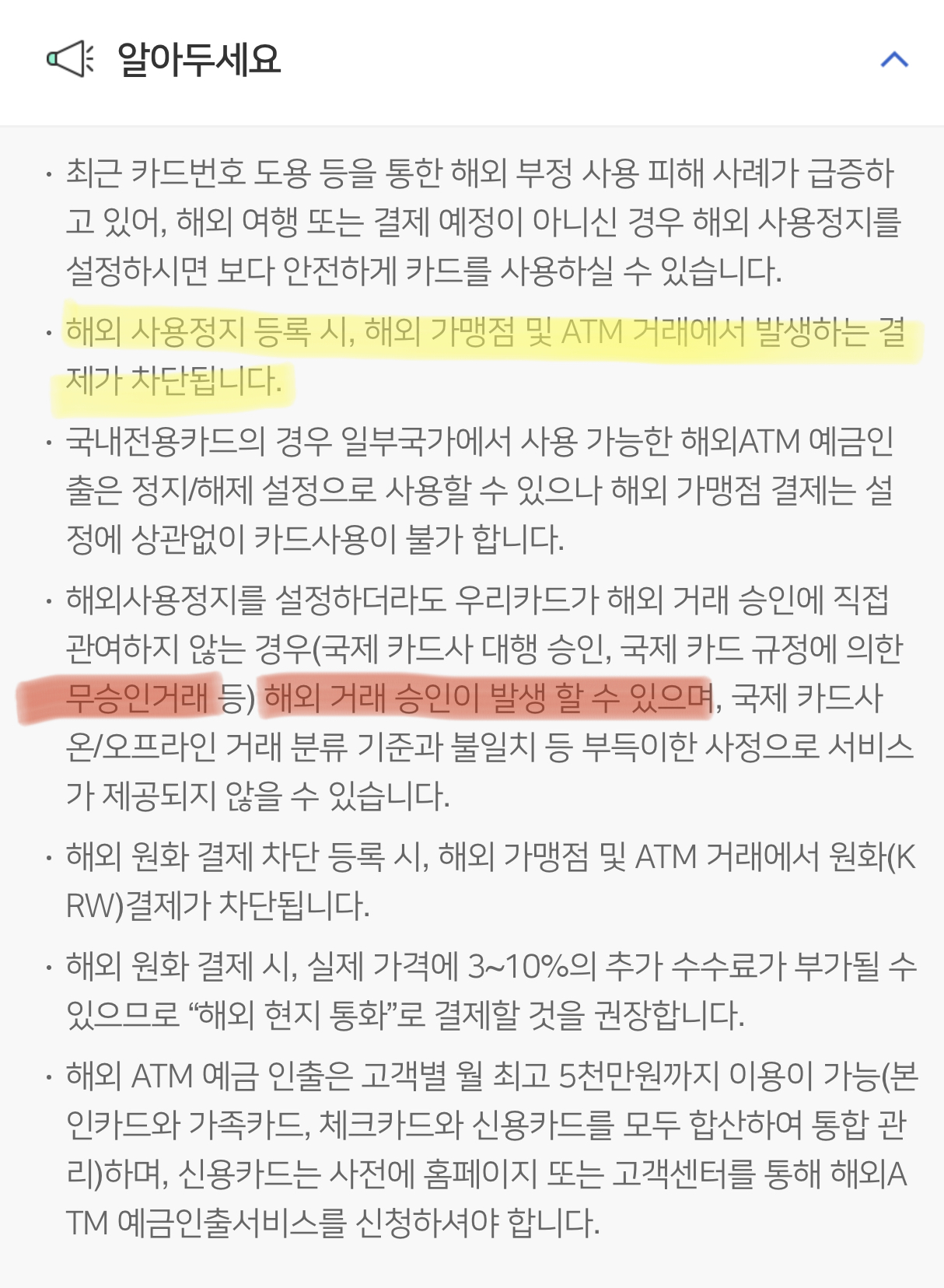 처음엔 해외이용 해제만 하면 되지 않을까? 싶었습니다. 그러면 해외 가맹점에서 발생하는 결제 차단할 수 있으니까 해외 후불 결제도 막을 수 있지 않을까 싶었어요.