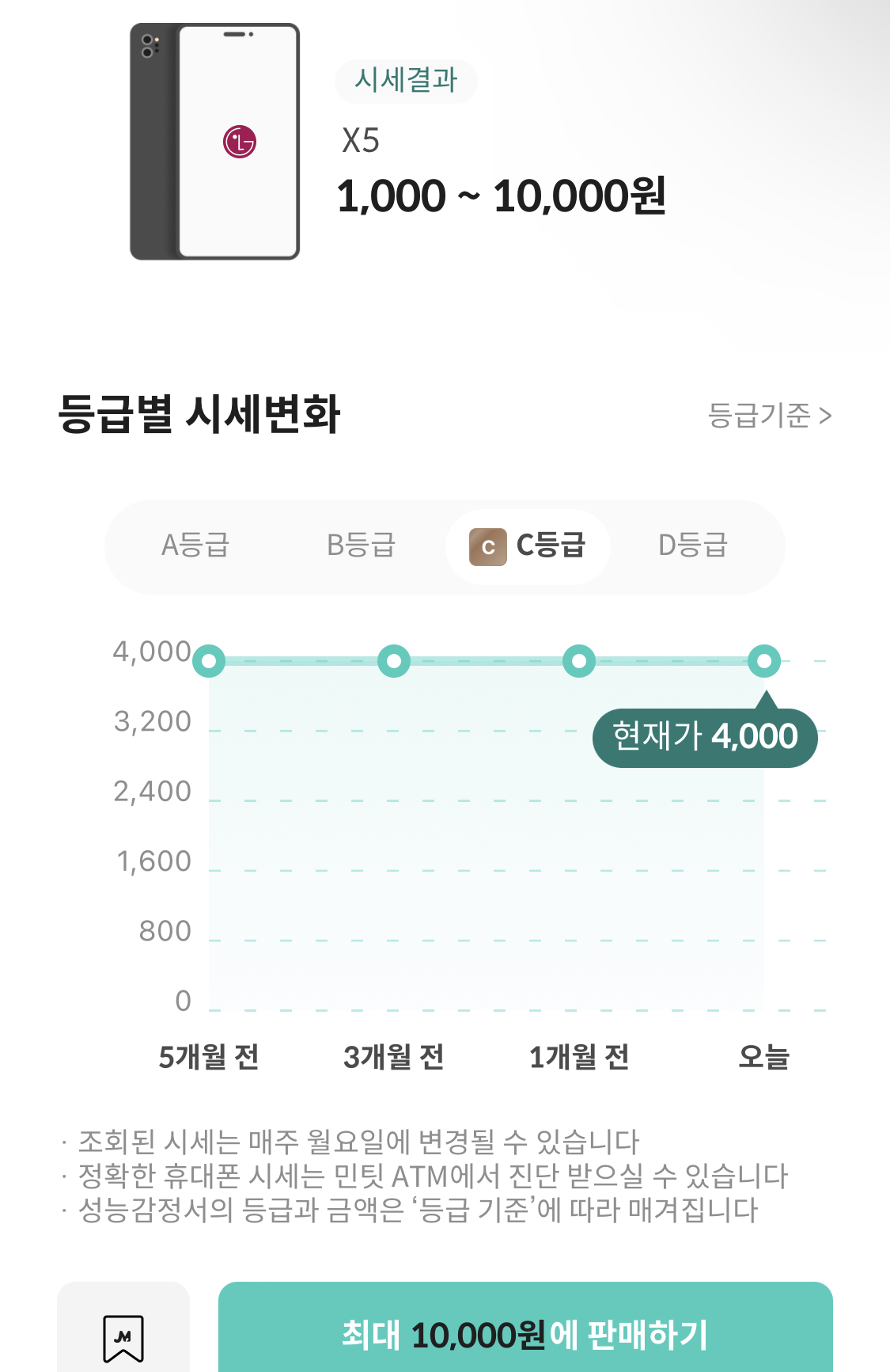 그리고 민팃 사이트에서 시세 조회, 금액 예측 가능합니다. 제가 판매할 LG 스마트폰 X5 시세는 A급일 경우 최대 만원, 액정 파손 있음에 체크했더니 1,000원이 나오더군요.