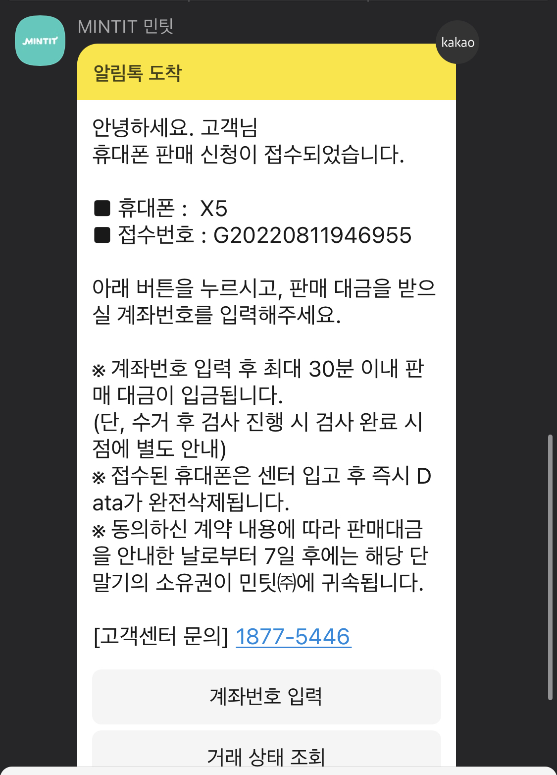 계좌로 입금받기를 선택하니 계좌번호를 입력하라고 카톡이 옵니다.
