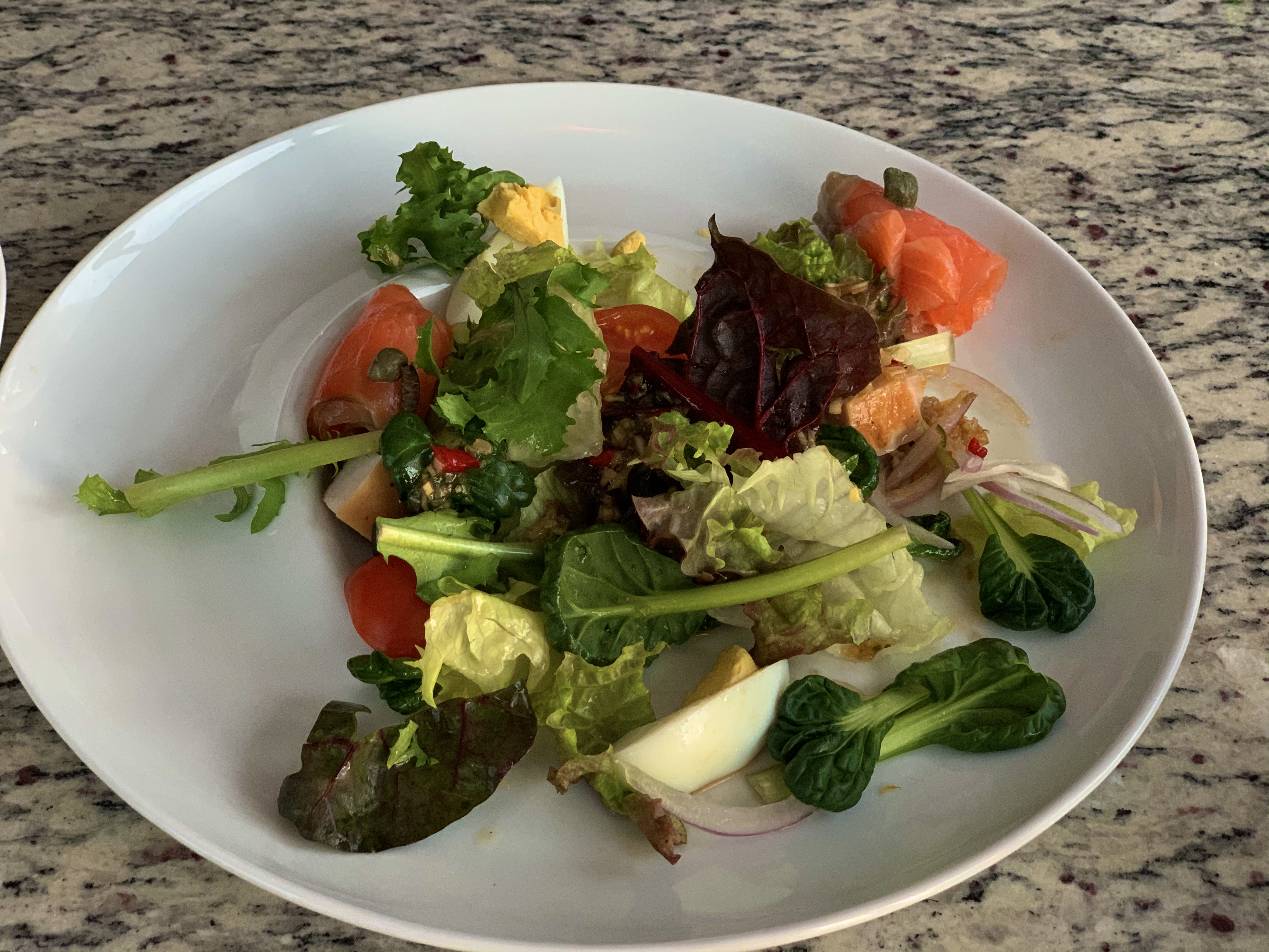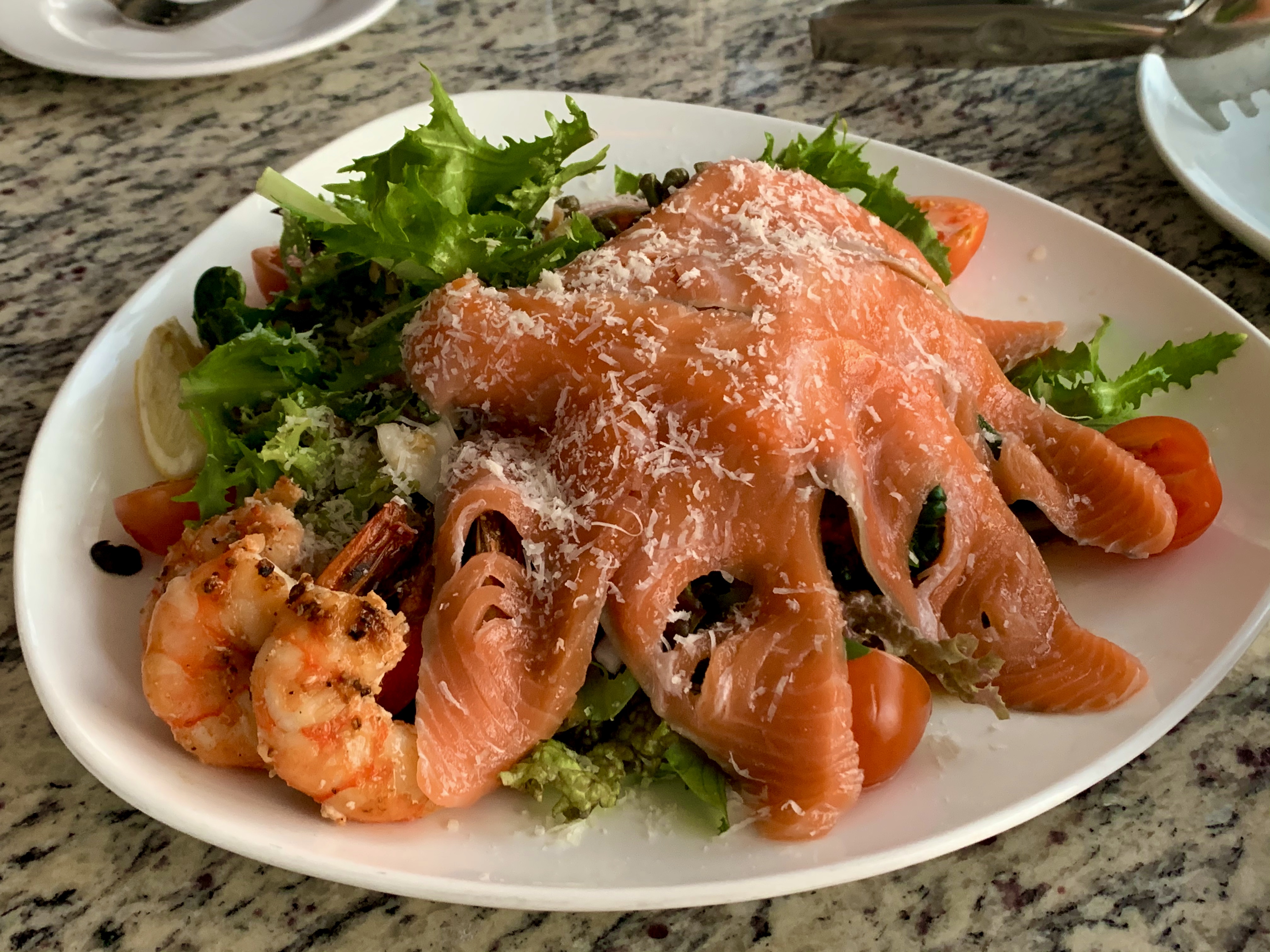 훈제연어와 새우가 실하게 들어있습니다. 상큼한 맛의 샐러드. 양도 풍성합니다