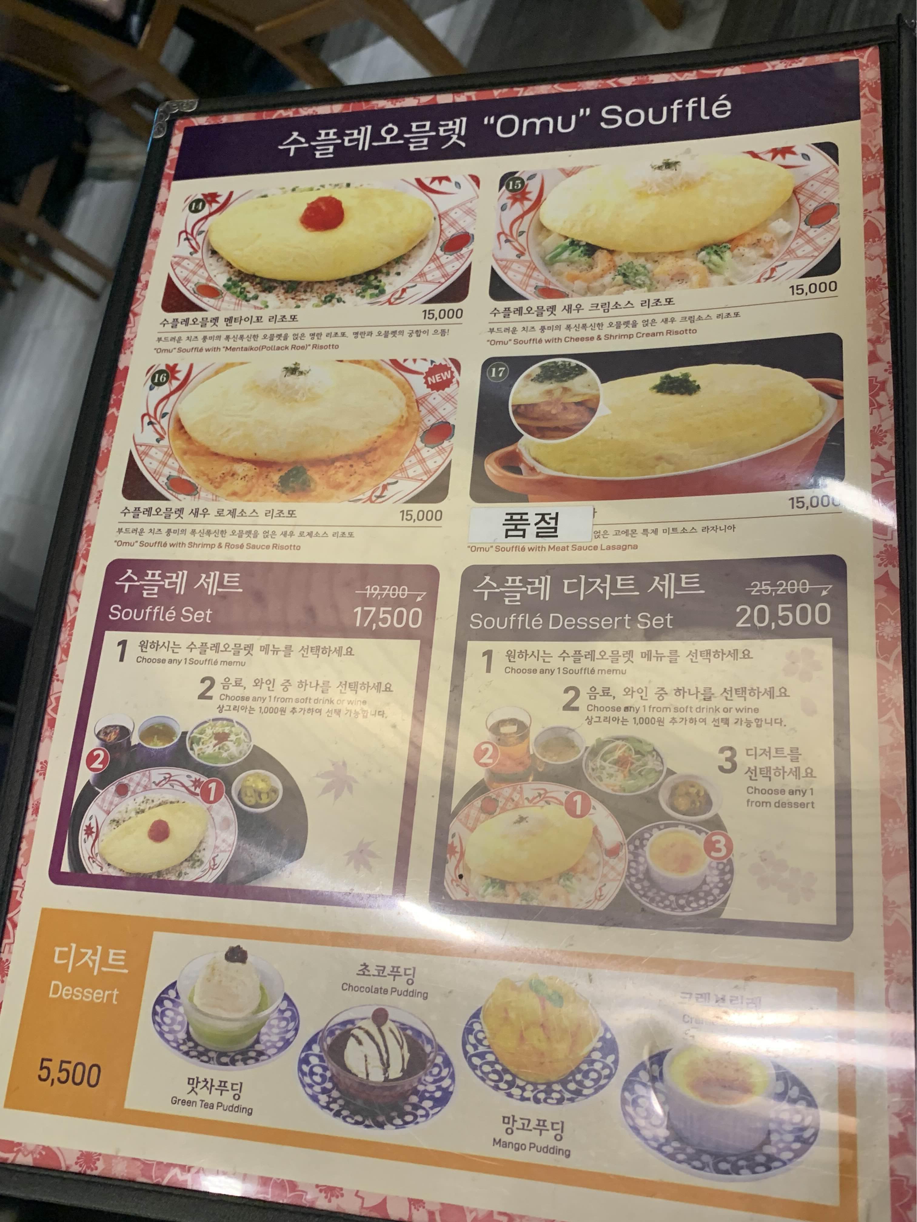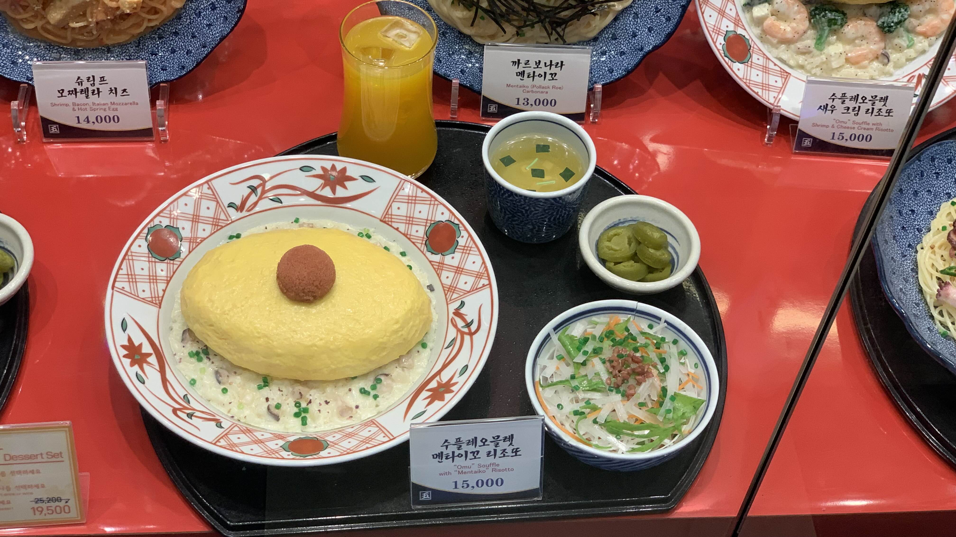 수플레 오믈렛은 새우 크림 리조또•멘타이꼬 리조또•로제 리조또 여러 종류가 있다.