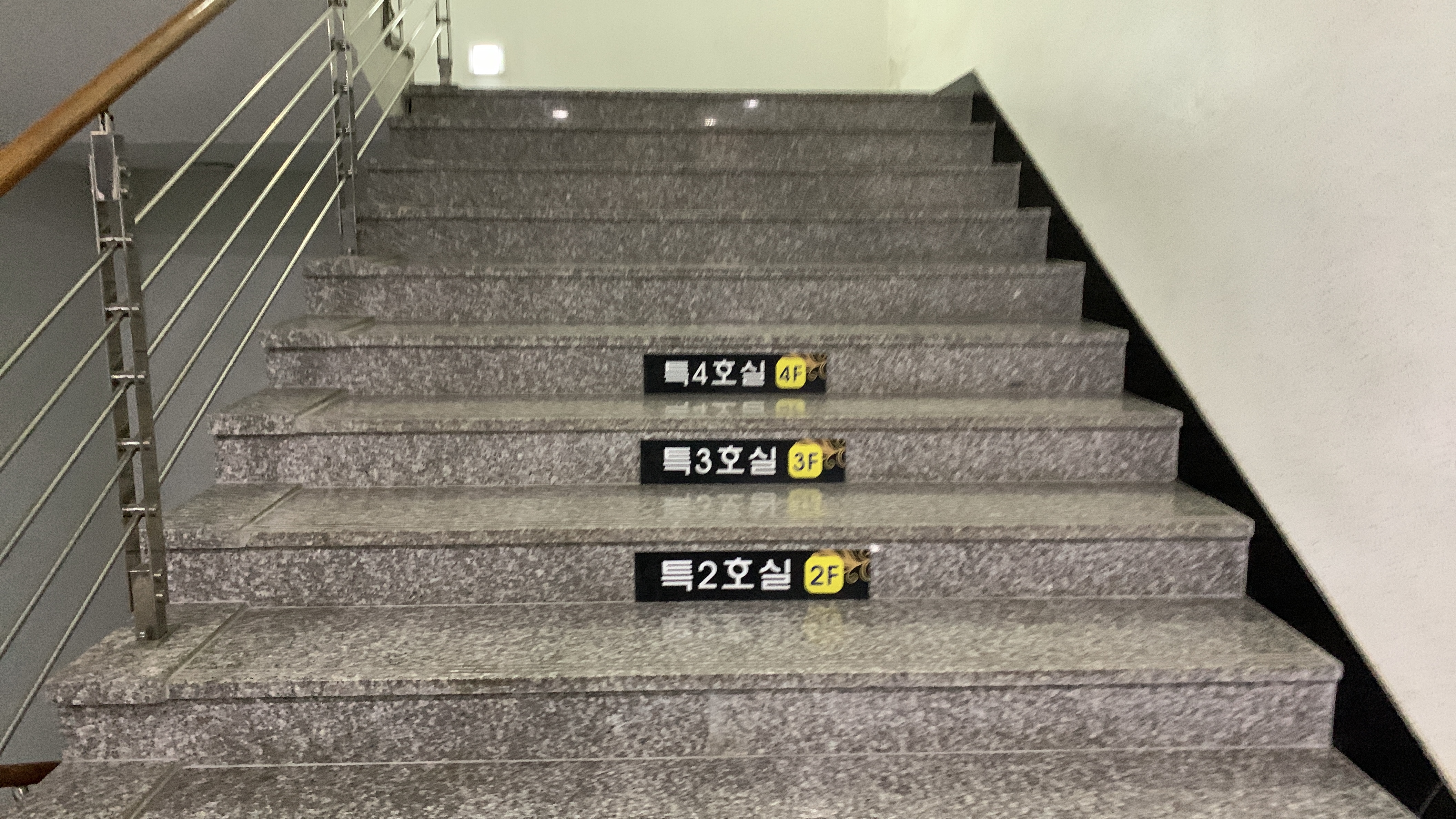 죽 늘어선 근조화환 지나쳐 계단으로 올라간다. 각 층마다 특 1호실, 특2호실, 특3호실, 특4호실이 자리하고 있다.