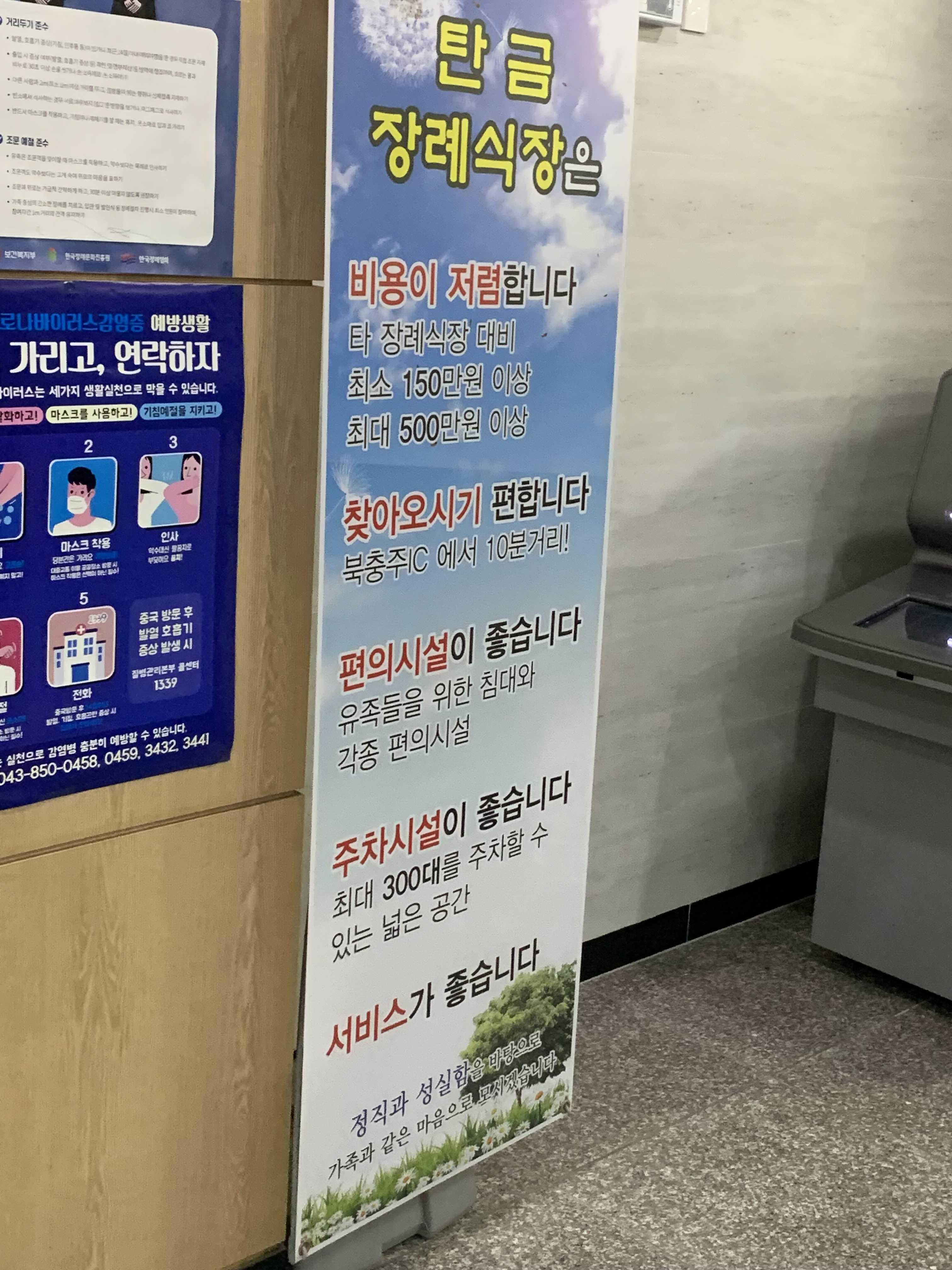 탄금장례식장. 홍보 문구대로 타 장례식장 대비 가격 저렴한 편이고 위치 좋고 주차시설, 편의시설이 우수하다.