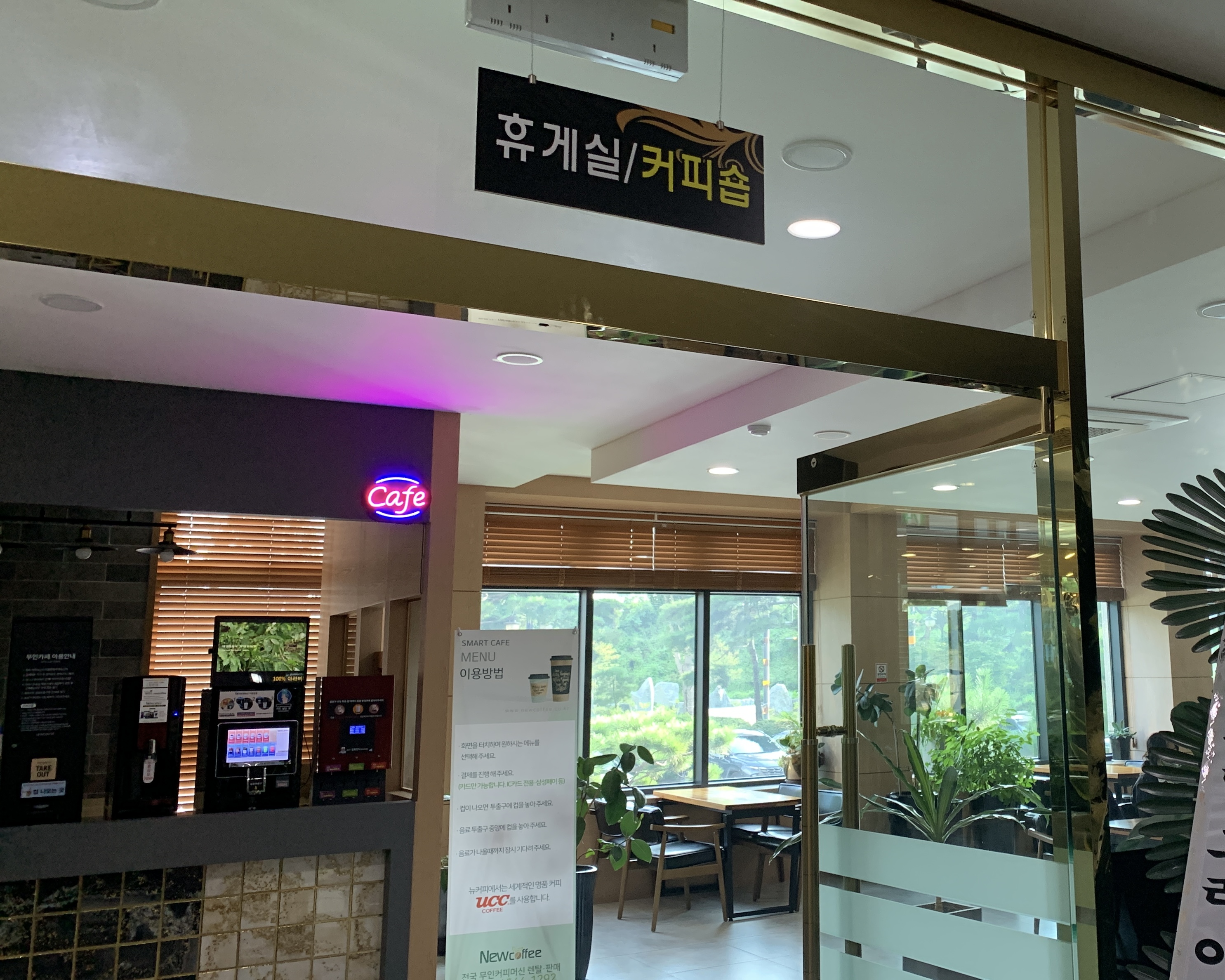 1층의 오른편에는 ATM이 있어서 급히 돈 출금이 가능하다. 1층 왼편에는 휴게실이 있다. 무인 커피머신과 음료머신이 구비되어 있다. 카페처럼 넓은 이 공간은 24시간 개방된다.