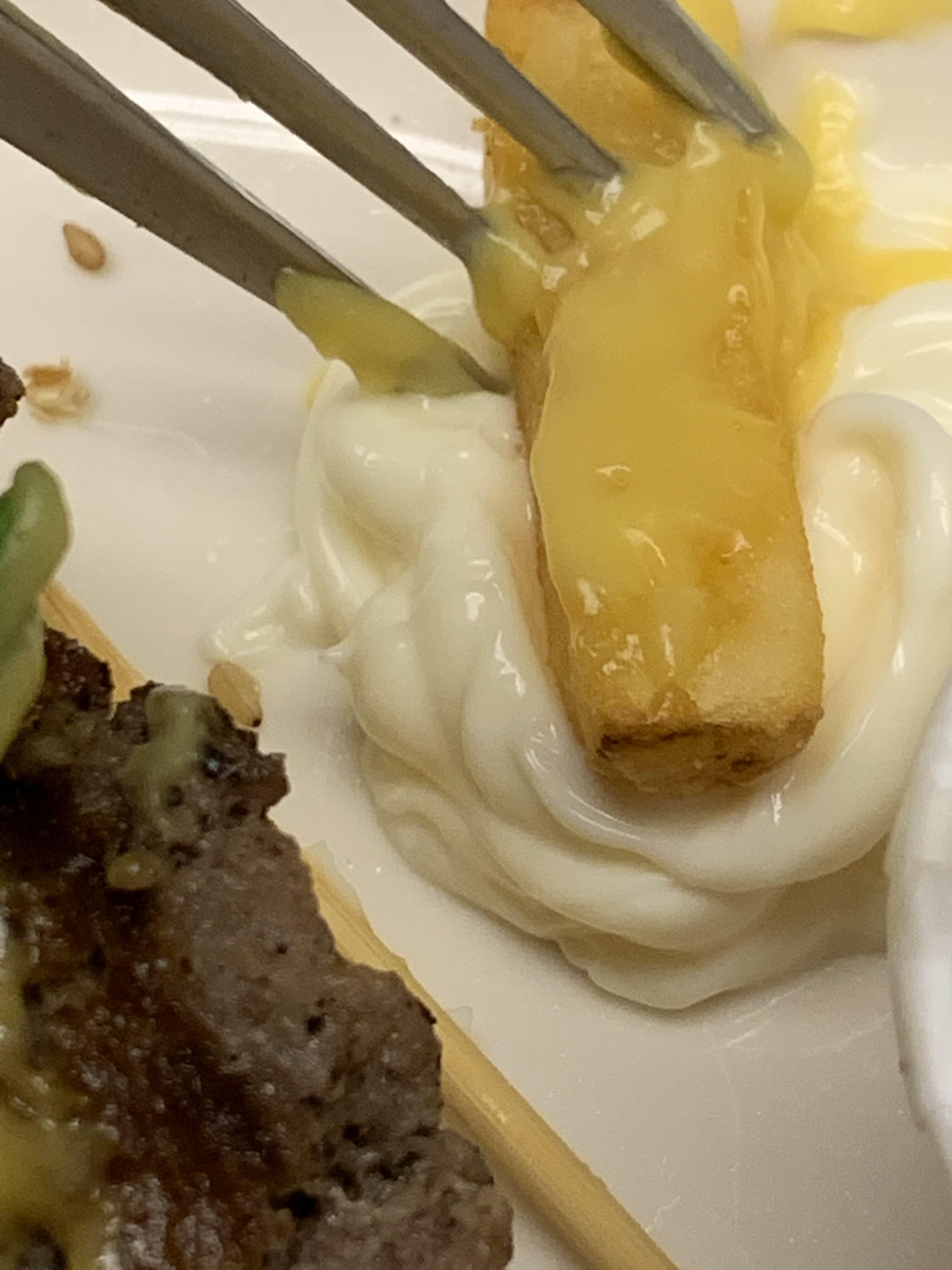 치즈가 올라가 있어서 그냥 먹어도 맛있지만 소스통의 마요네즈를 찍어 먹으면 풍미 있고 더 맛이 좋다.