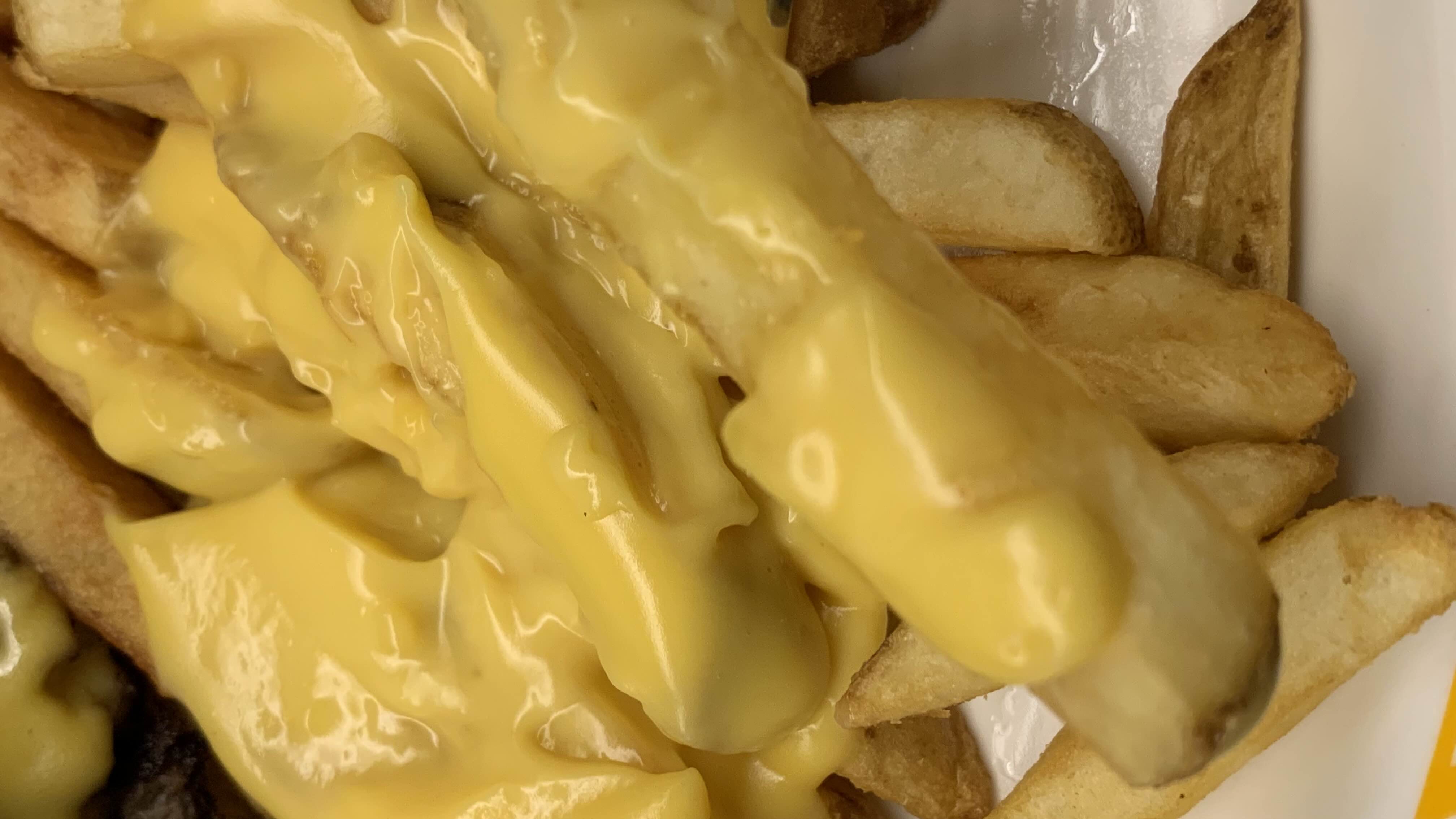 체다치즈가 올라간 갓 튀겨진 감자튀김. 두께감이 있는 감자튀김이다.