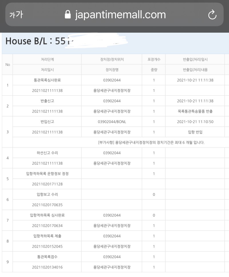 재팬타임몰 해운 특송(선편 운송) 진행 내역