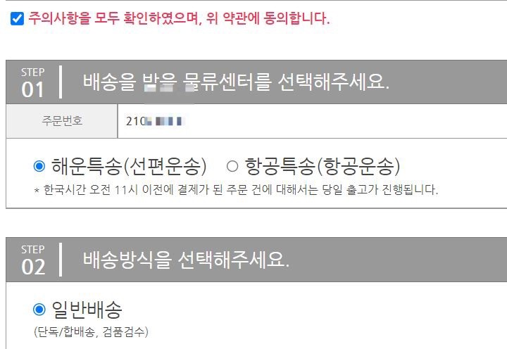 1. 해운특송(선편운송), 항공운송 중 원하는 배송방법 선택