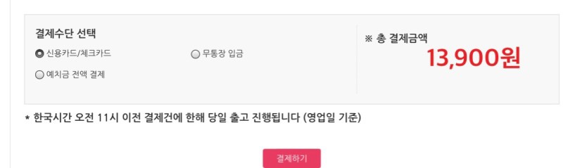 그후에 결제수단을 선택한다. 신용카드 체크카드 무통장입금 예치금 전액 결제 가능.