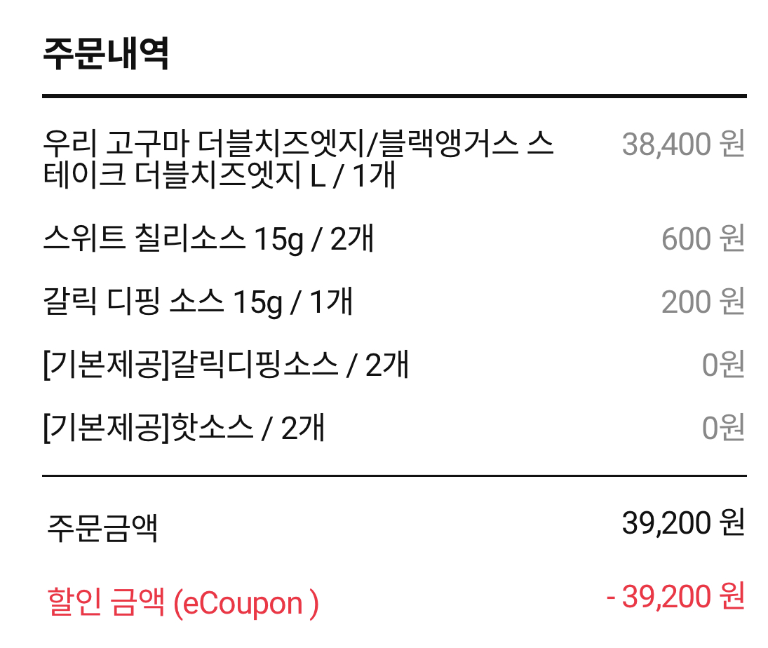 기프티콘은 39,200원. 기프티콘 가격 맞춰야 기프티콘 사용 가능하기에, 800원어치 소스 추가해서 금액 딱 맞춰 0원에 주문했다.