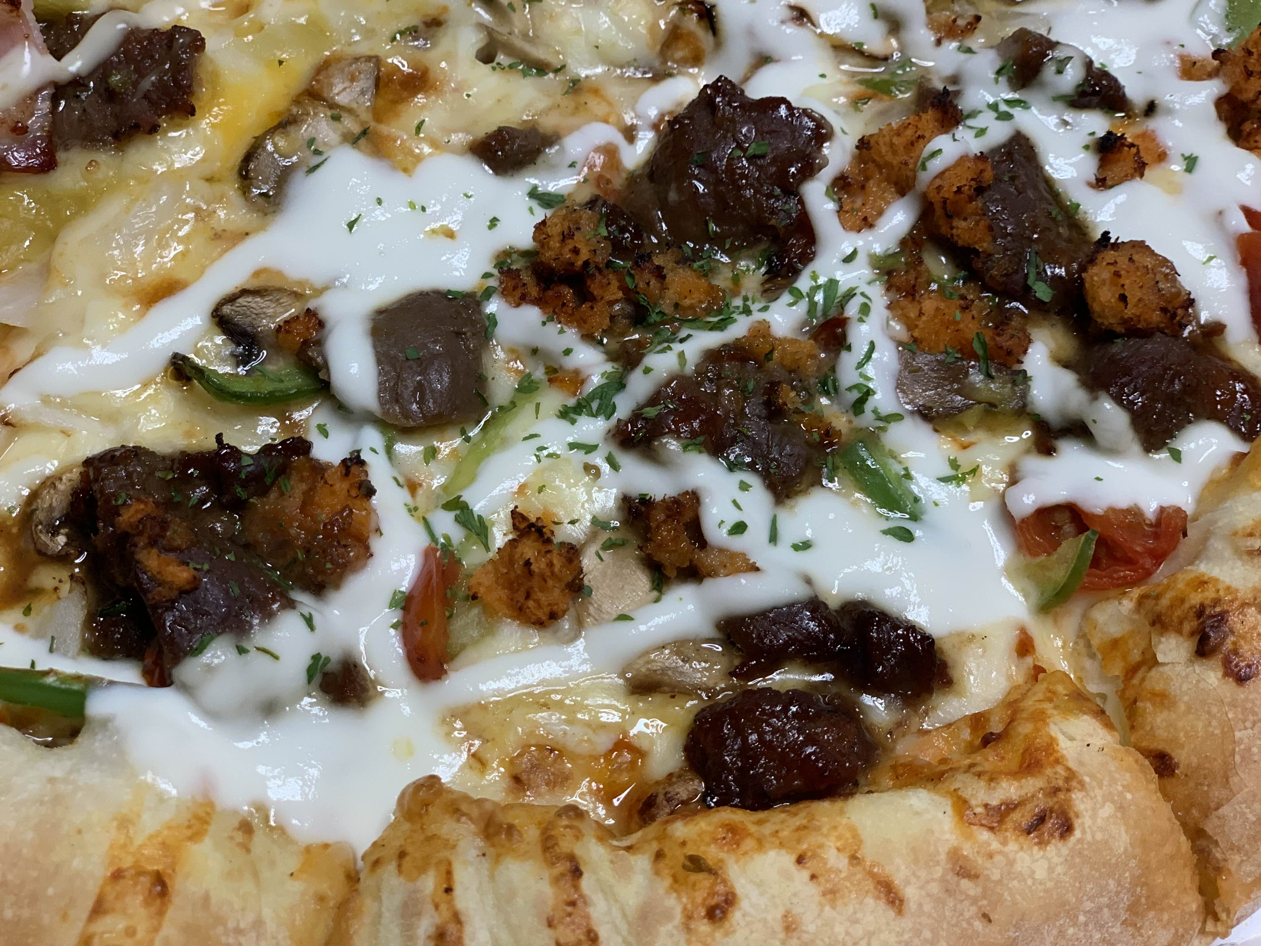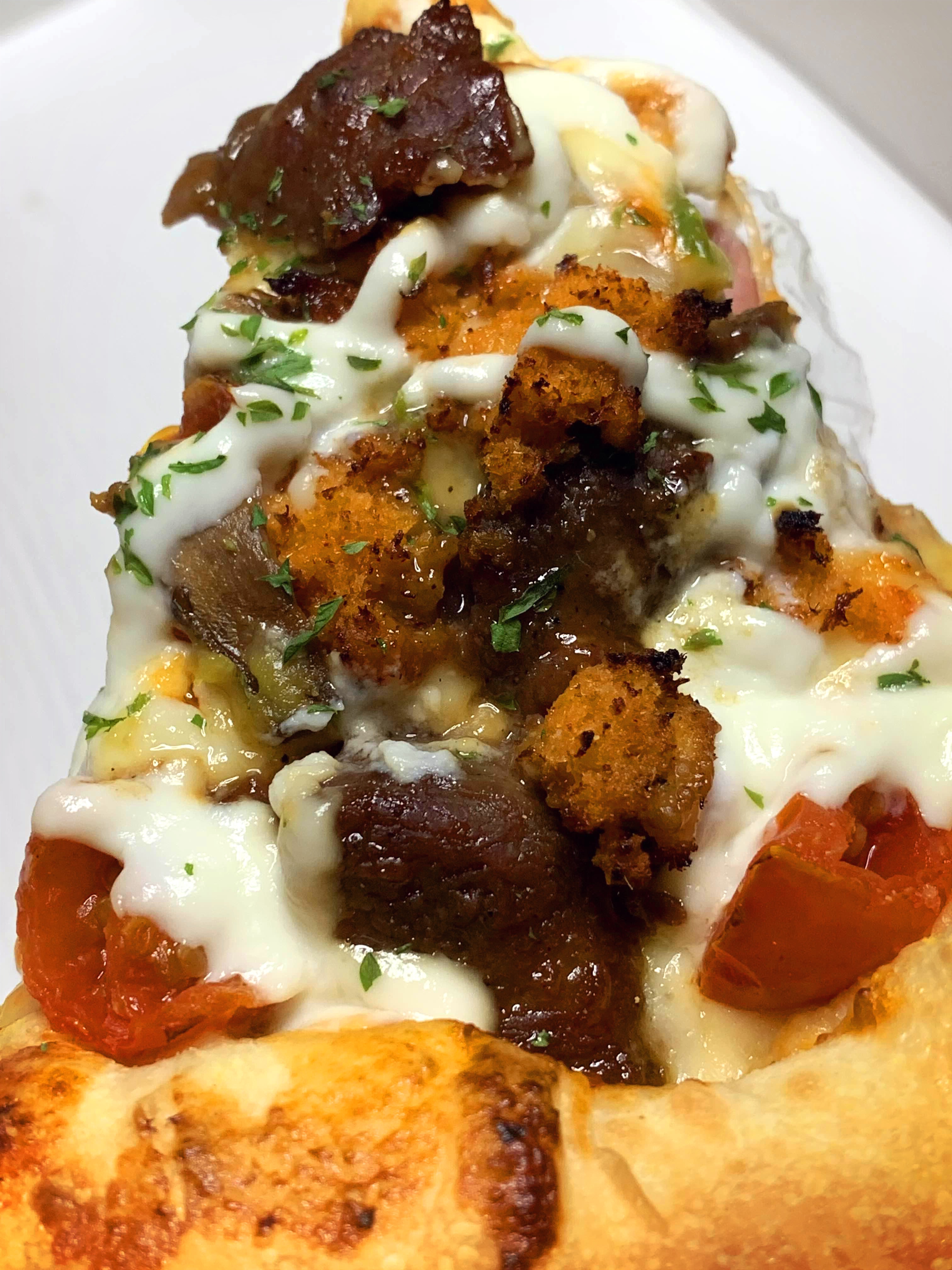 아라비아타 소스와 부드러운 페터크림, 모차렐라 치즈, 비프의 조화가 좋은 블랙 앵거스 스테이크 피자.