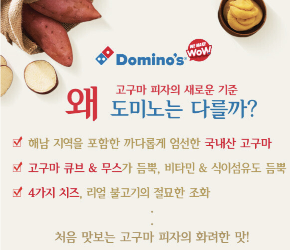 처음 시켜본 도미노의 고구마 피자 예상보다 더 맛있었다. 고구마피자 좋아하는 분들께 특히 추천한다.